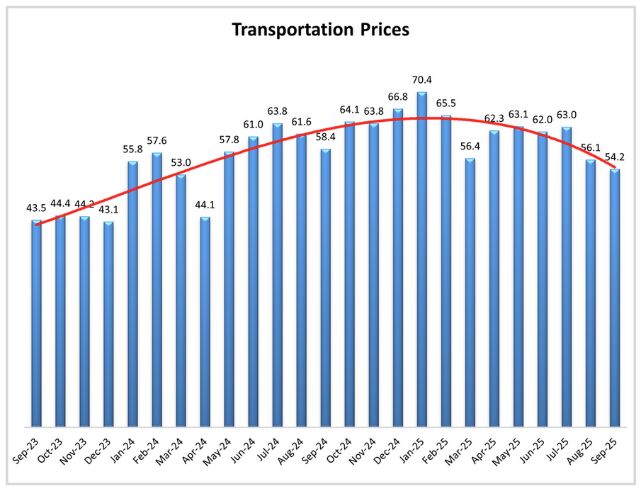 Transportation Capacity slipped -0.7 pts to 54.5, showing slower expansion.