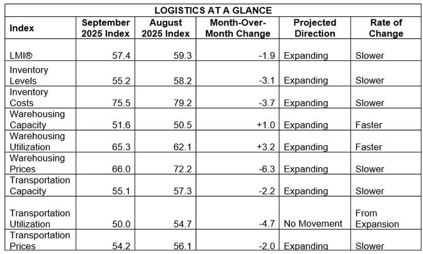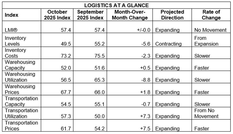The Logistics Managers’ Index held steady at 57.4 in October 2025 (unchanged MoM), reflecting offsetting trends of easing inventory and warehousing activity balanced by a sharp rebound in transportation.