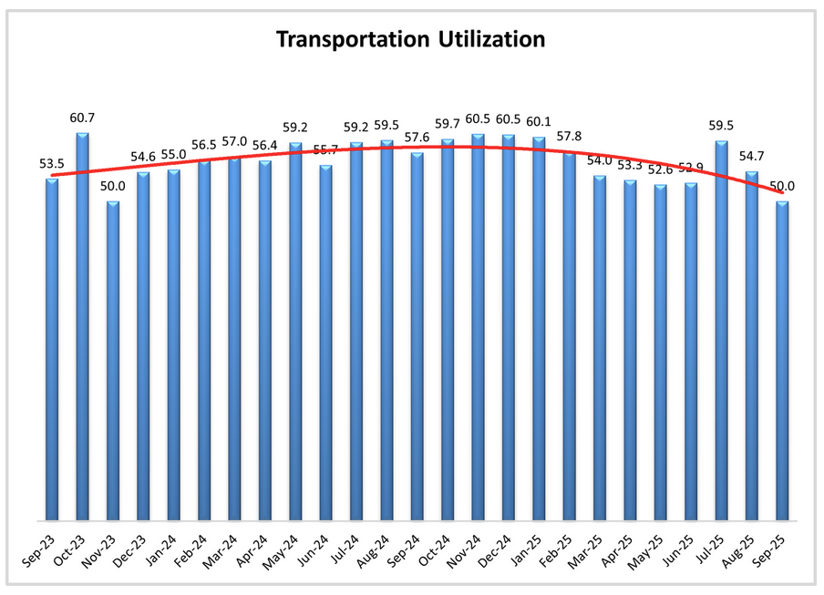 Transportation Utilization jumped +7.3 pts to 57.3, reflecting a surge in freight movement late in the month.