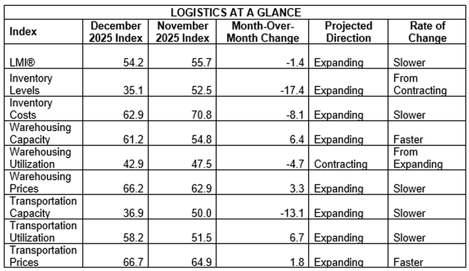 The December Logistics Manager’s Index eased to 54.2 (from 55.7 in November), marking the slowest expansion since April 2024 amid an extreme inventory drawdown and softer warehousing conditions.