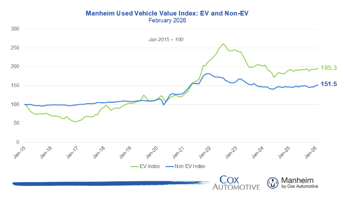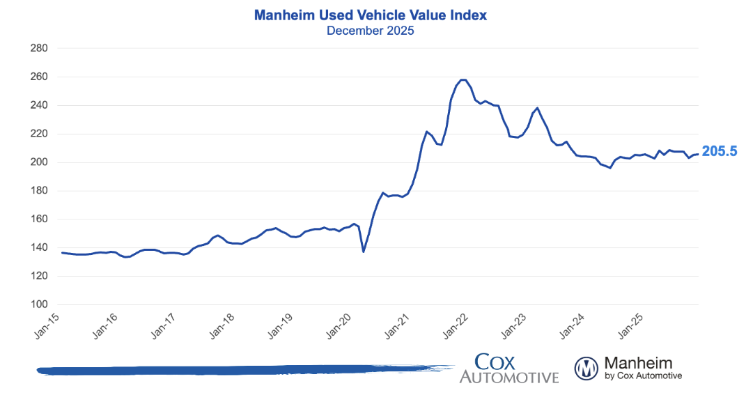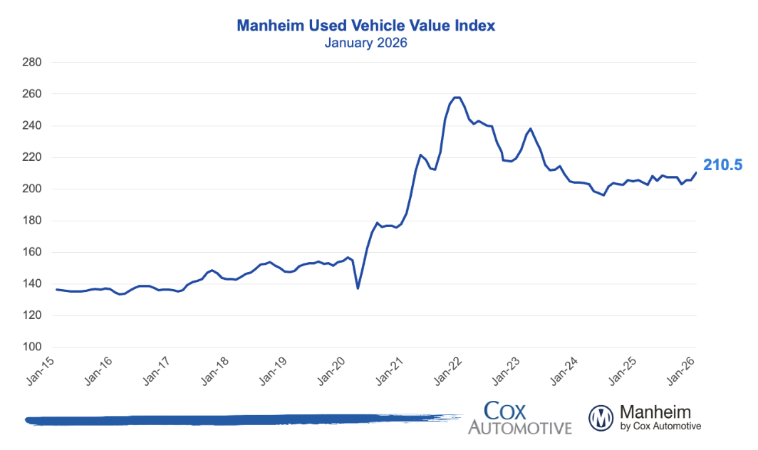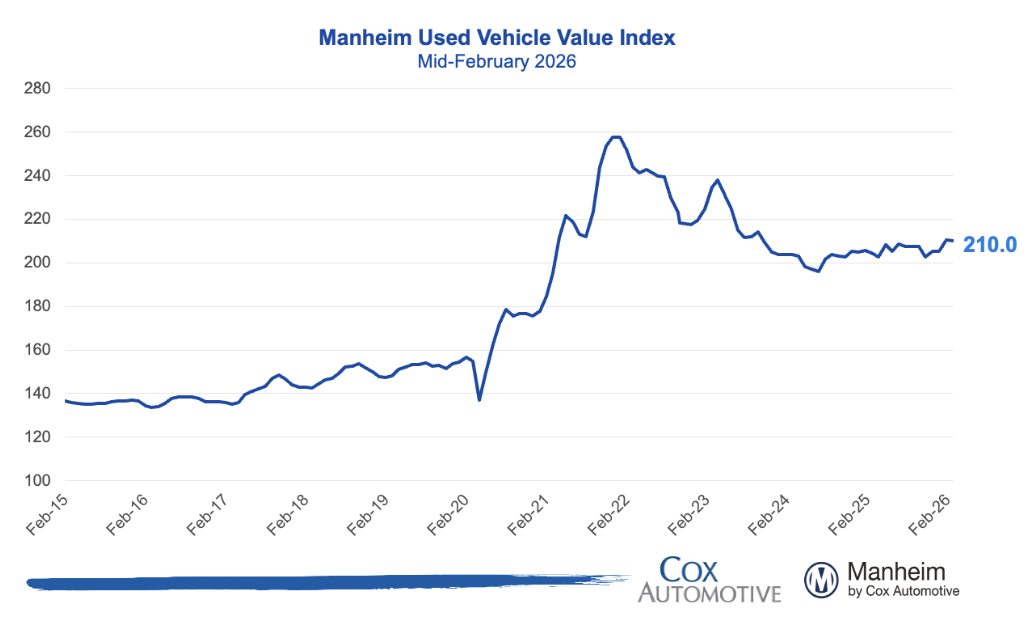 The Manheim Used Vehicle Value Index increased to 212.3 (+0.8% MoM; +4.0% YoY), exceeding the typical February seasonal pattern in which prices historically decline about -0.2% MoM.