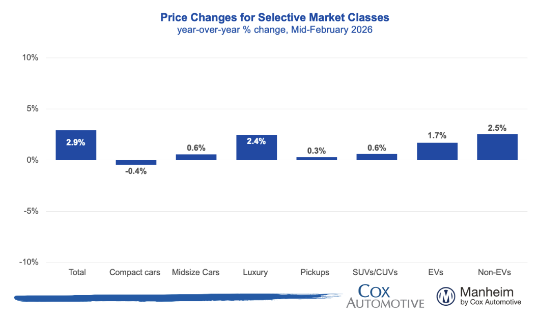 The Manheim Used Vehicle Value Index rose +0.8% MoM and +4.0% YoY to 212.3 in February, showing stronger-than-seasonal wholesale used vehicle price gains alongside firm dealer demand and tight inventory conditions.