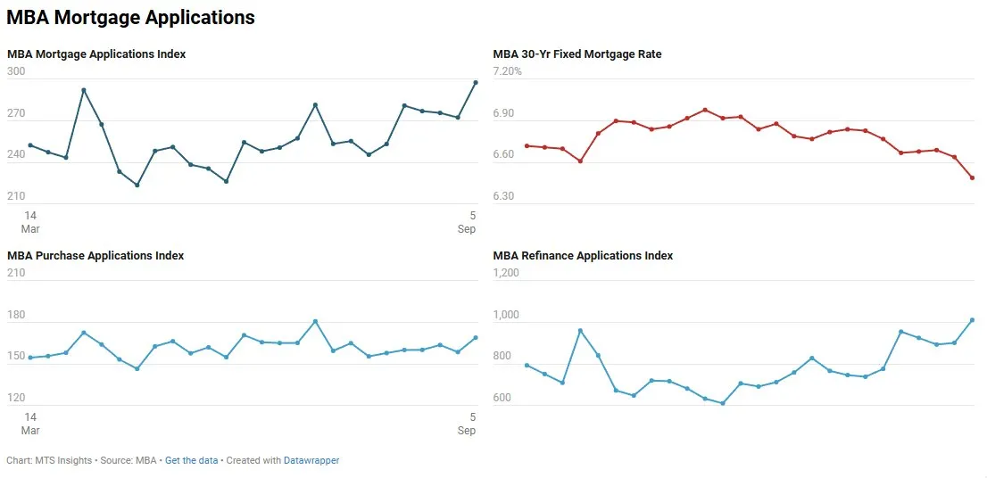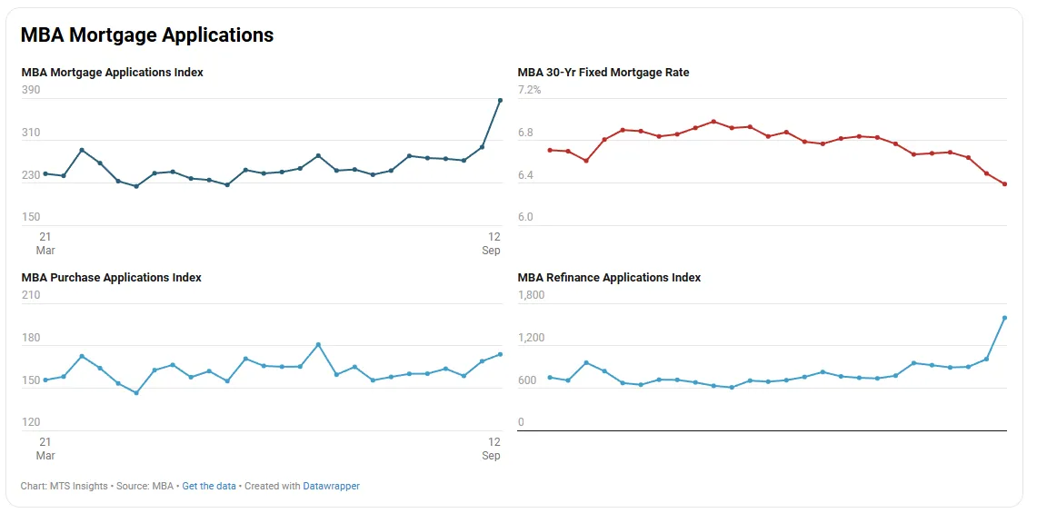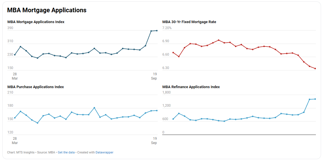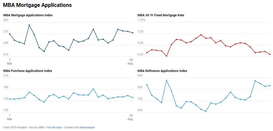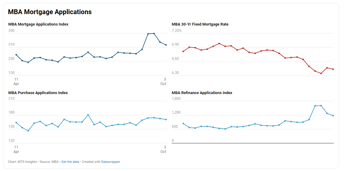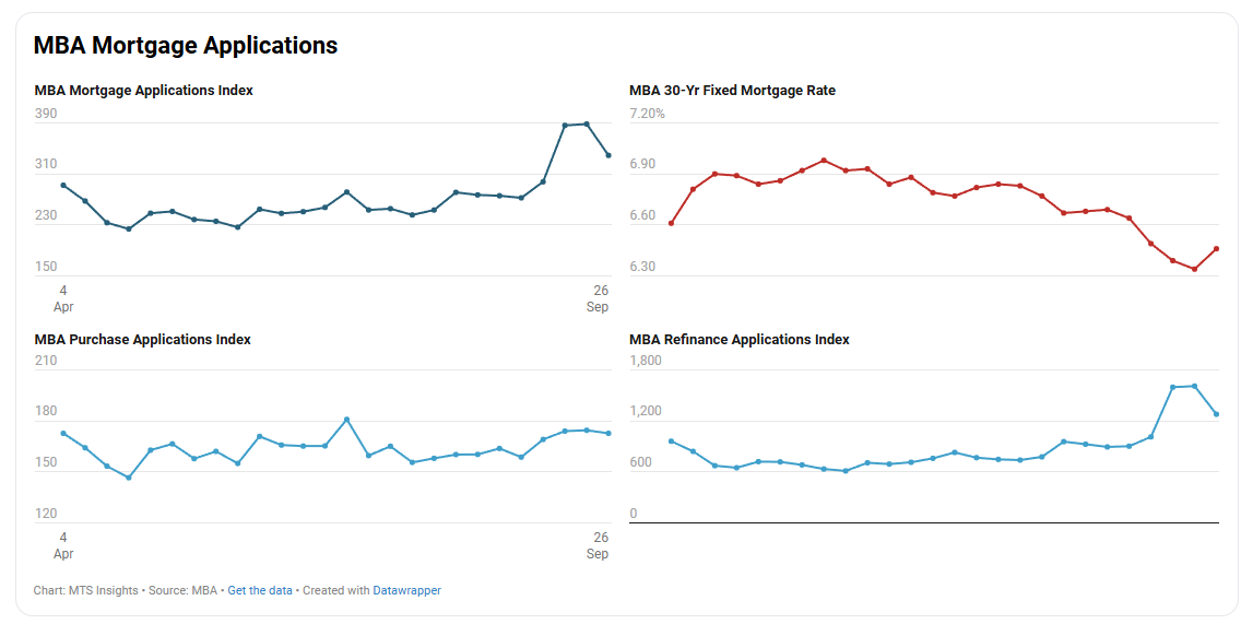 - The 30-year fixed mortgage rate fell just -1 bp to 6.42%, now up about 8 bps from the near-term low set three weeks ago in mid-September of 6.34%.