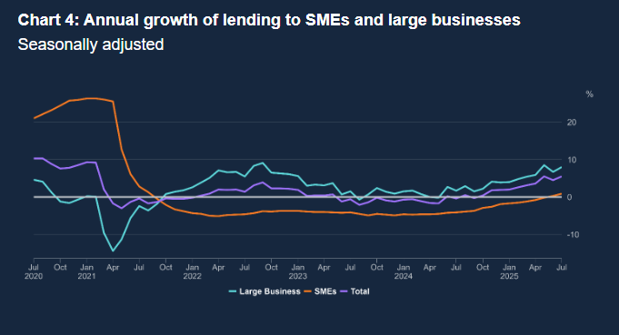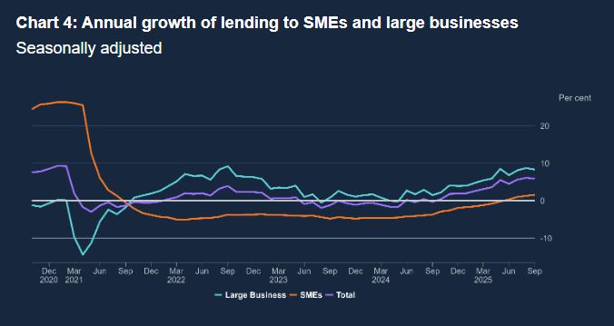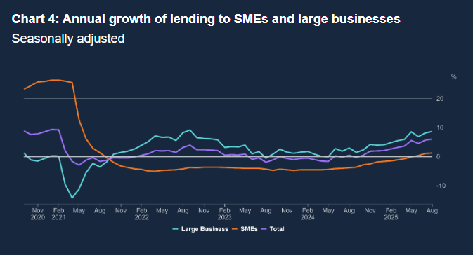 - The annual growth rate of borrowing by large businesses was 8.3% in September, down from 8.7% in August. The annual growth rate of borrowing by SMEs increased to 1.6% from 1.3% over the same period.