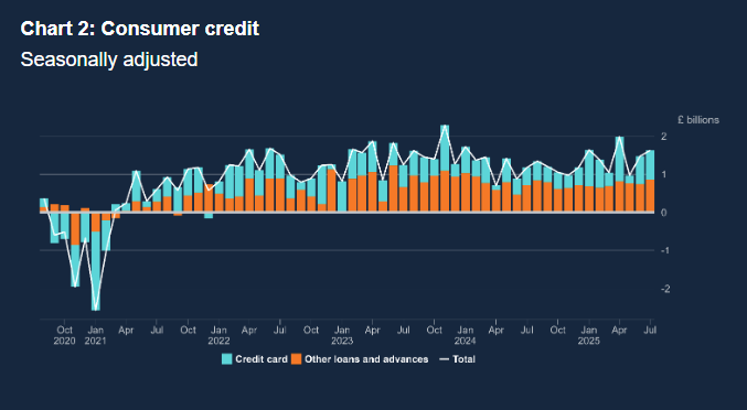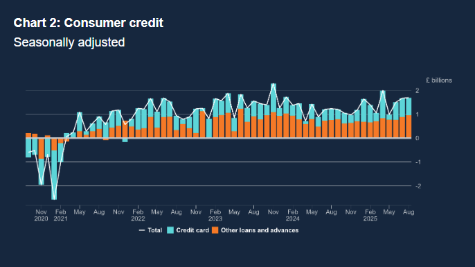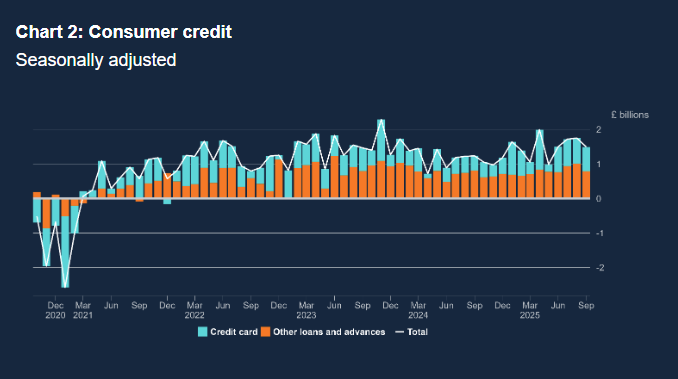- Net borrowing of consumer credit by individuals was £1.5 billion (+0.6% MoM) in September, down from £1.7 billion in August. Within this, net borrowing through credit cards was little changed at £0.7 billion in September. Net borrowing through other forms of consumer credit decreased to £0.8 billion, from £1.0 billion over the same period.