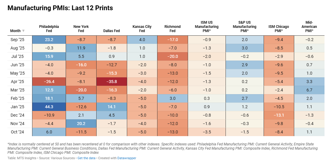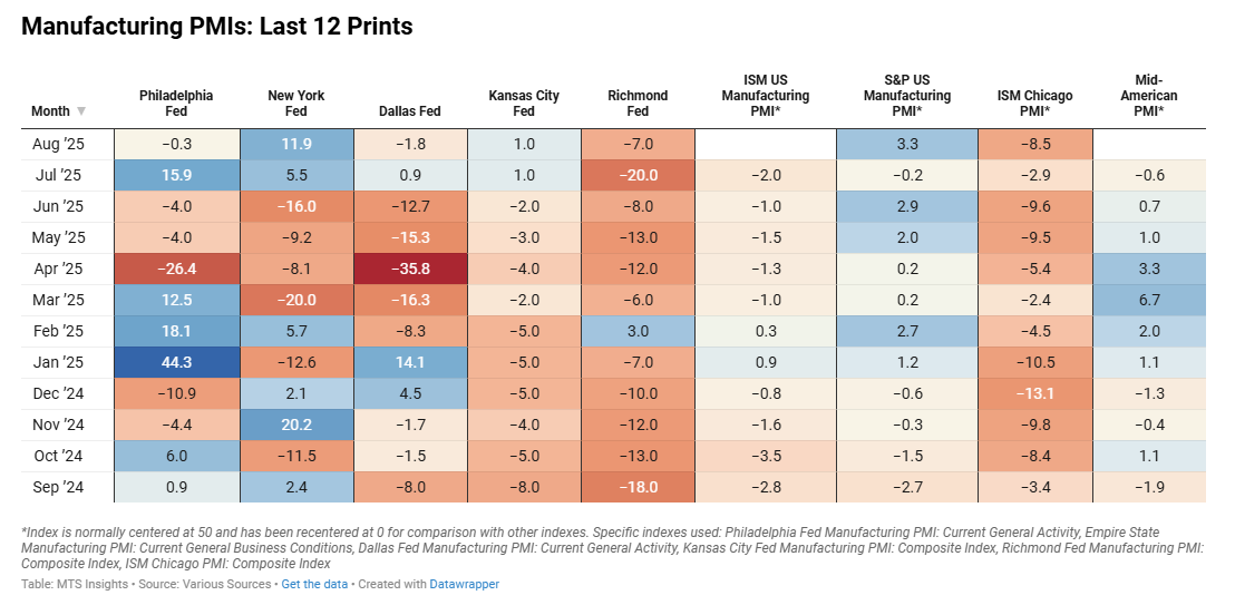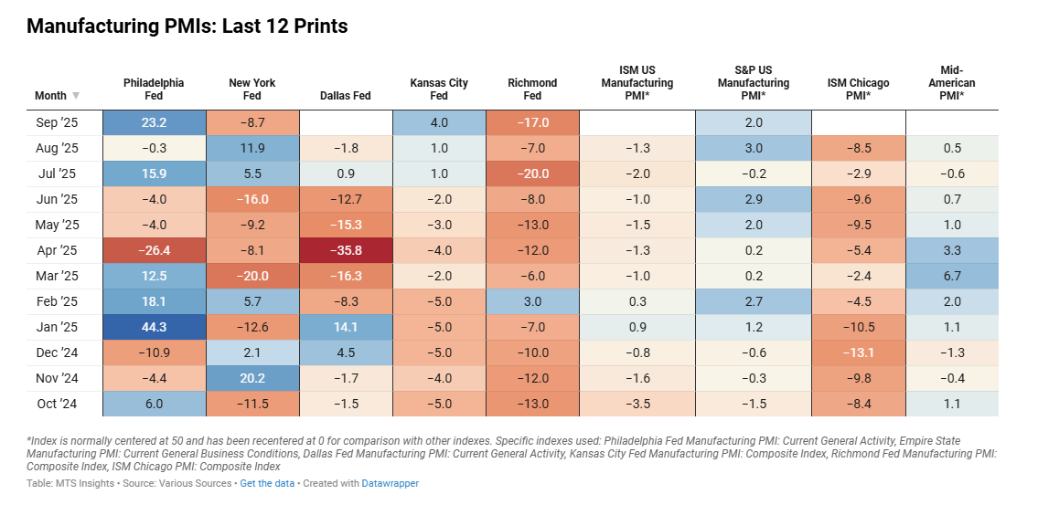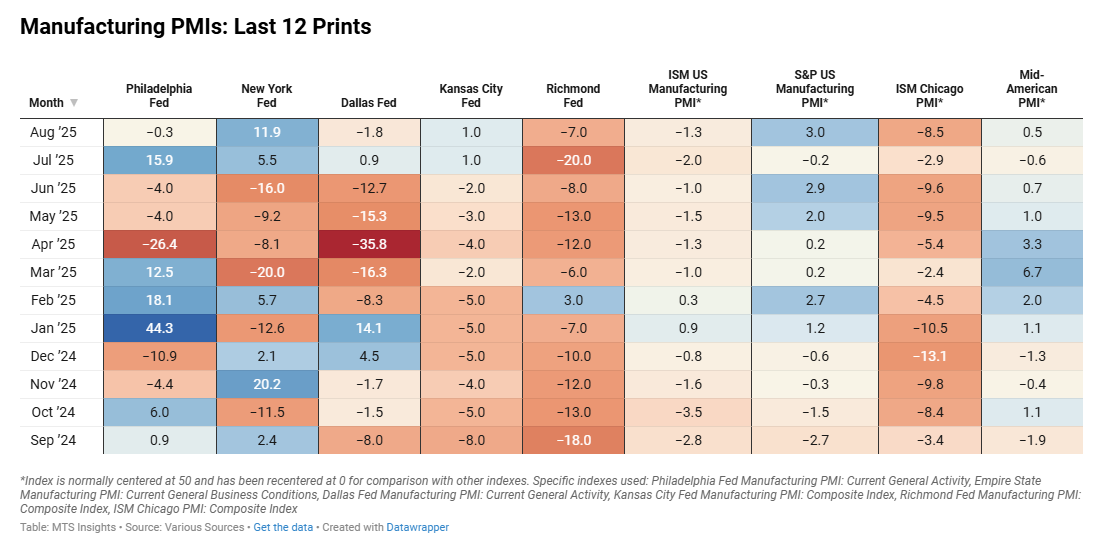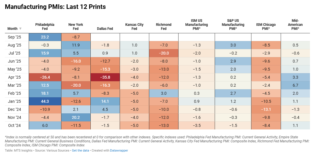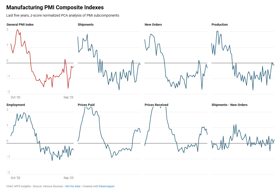 Index August 2025 September 2025 General PMI -0.31 -0.44 Shipments -0.05 -0.46 New Orders -0.09 -0.65 Production -0.13 0.30 Employment -0.34 -0.59 Prices Paid 0.96 0.63 Prices Received 0.92 0.36 The MTSI Manufacturing PMI Composite weakened to -0.44 in September, down from -0.31 in August, the lowest reading since June with all 9 PMIs reported.