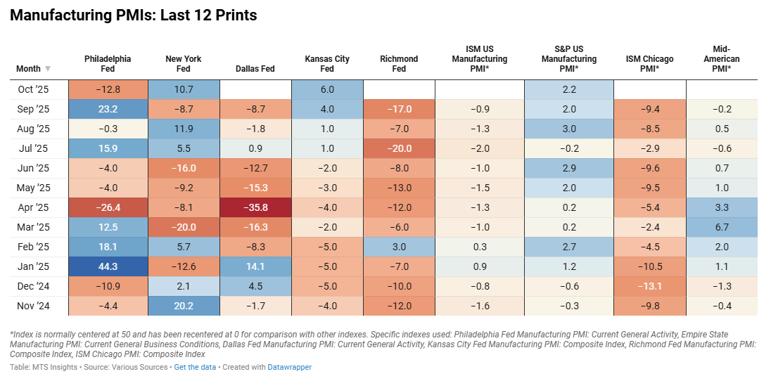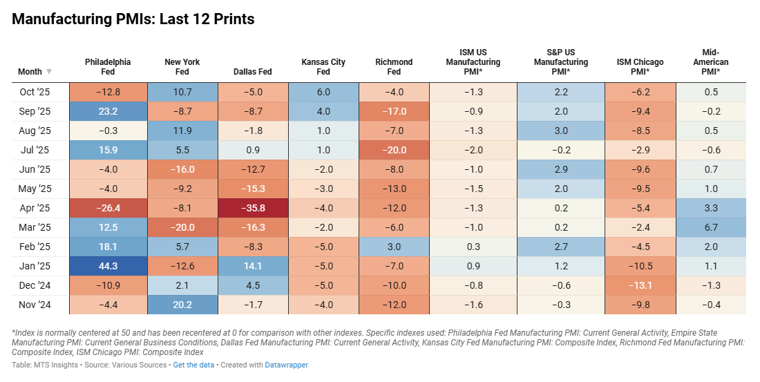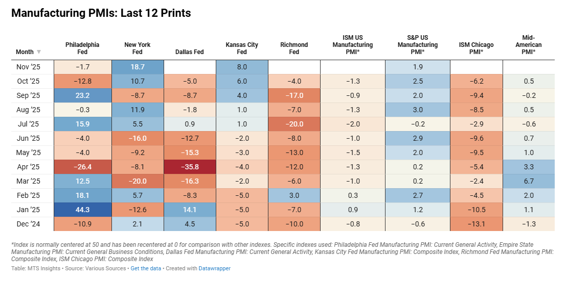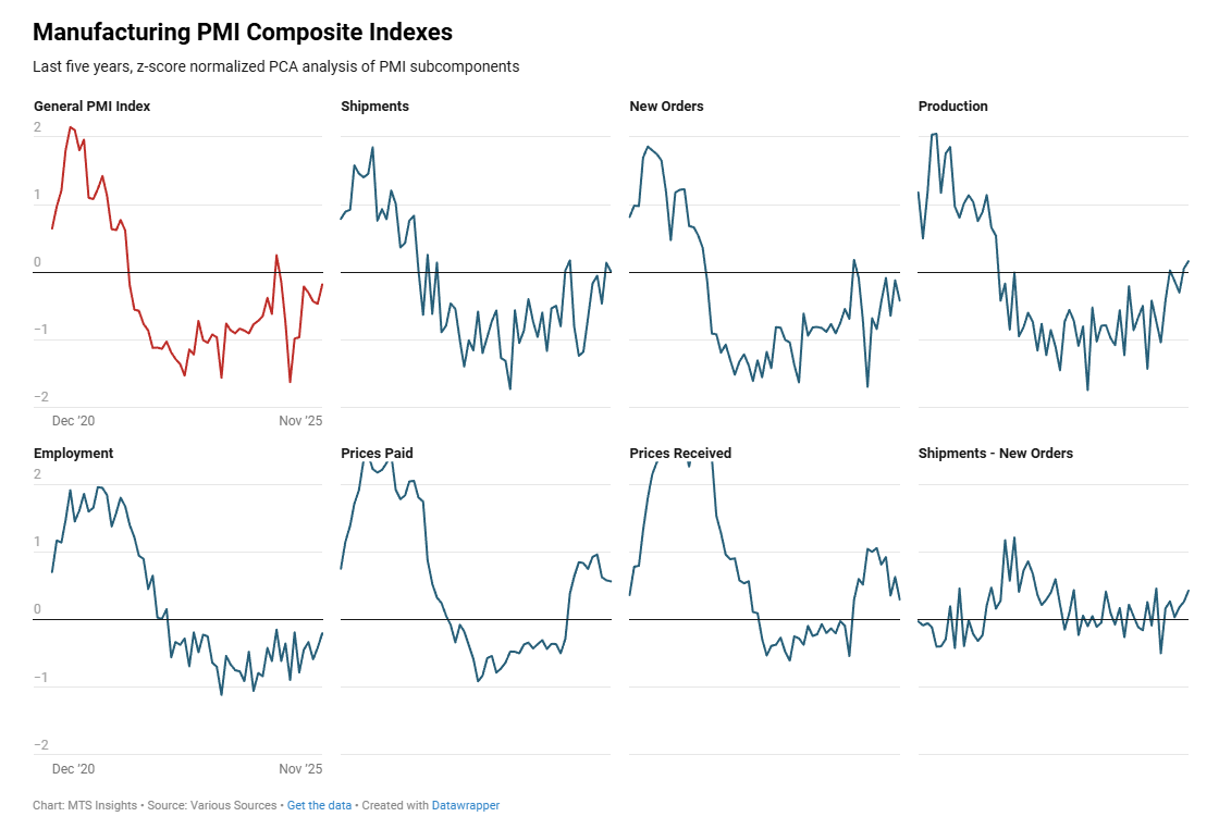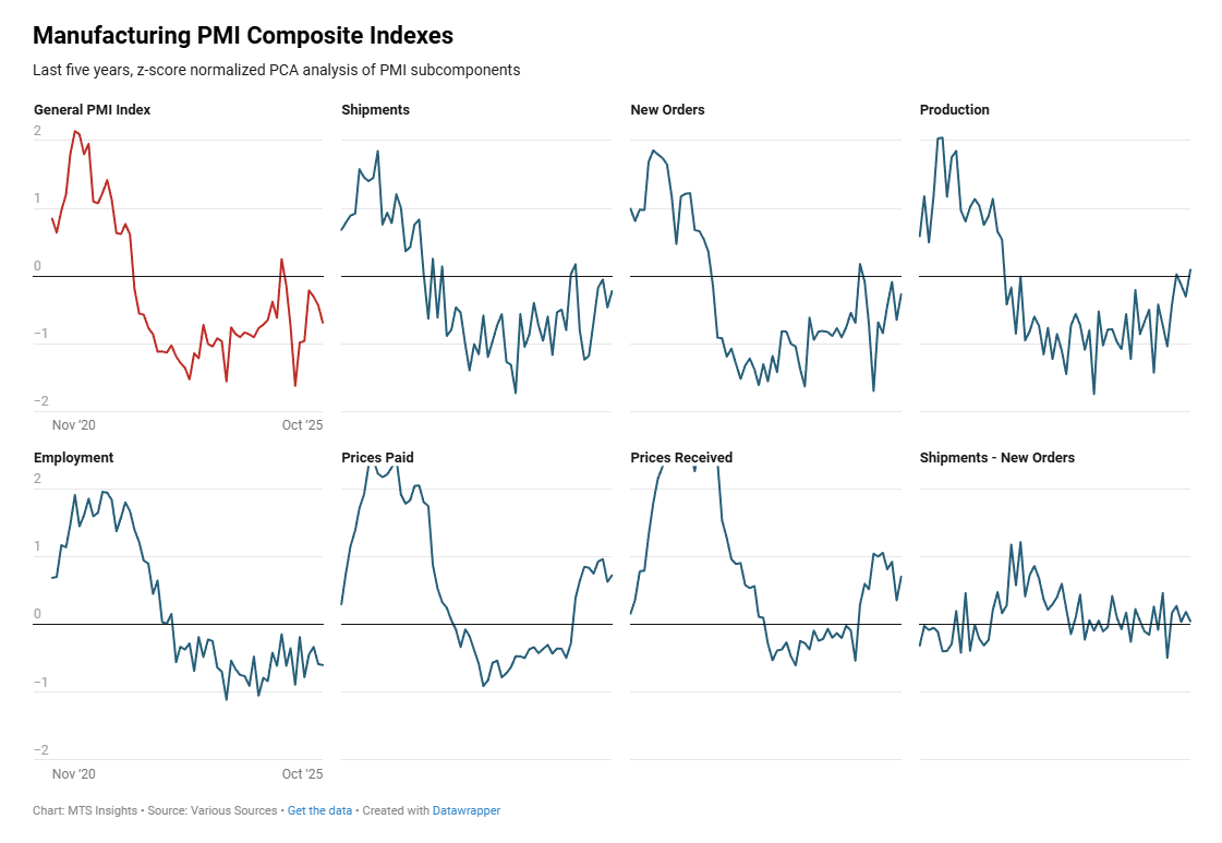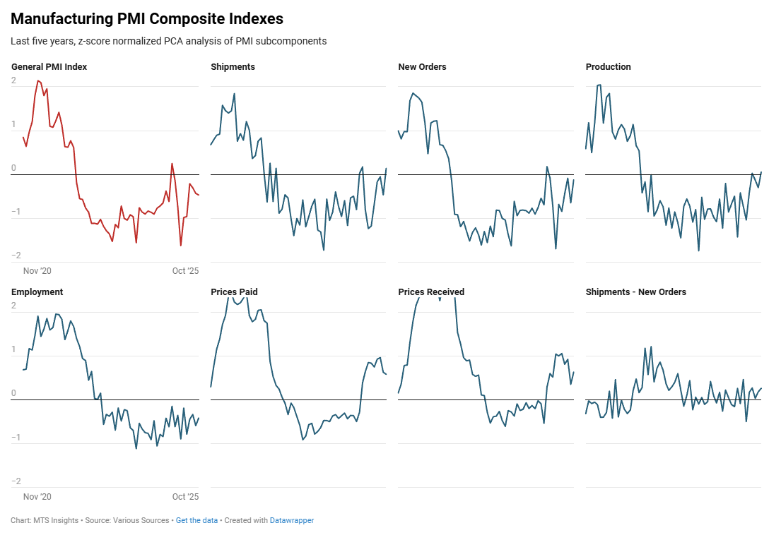 Index October 2025 November 2025 General PMI -0.47 -0.39 Shipments 0.14 -0.10 New Orders -0.12 -0.54 Production 0.05 0.71 Employment -0.42 -0.17 Prices Paid 0.58 0.59 Prices Received 0.63 0.35 The MTSI Manufacturing PMI General PMI Composite Index improved from -0.47 in October to -0.39 in November, revised down from the 1st estimate of -0.18, with 6 out of 9 PMIs reported.