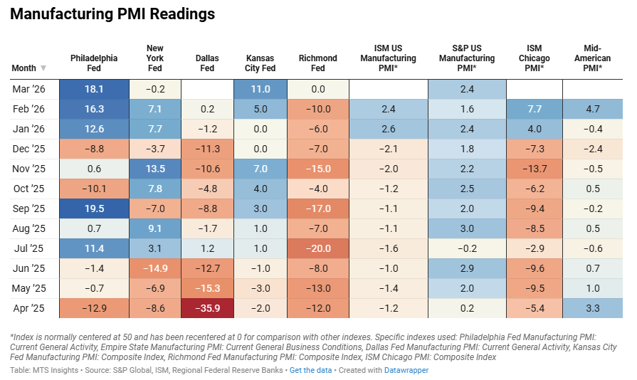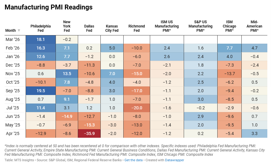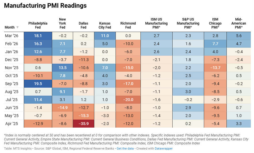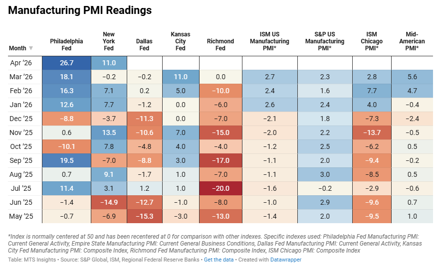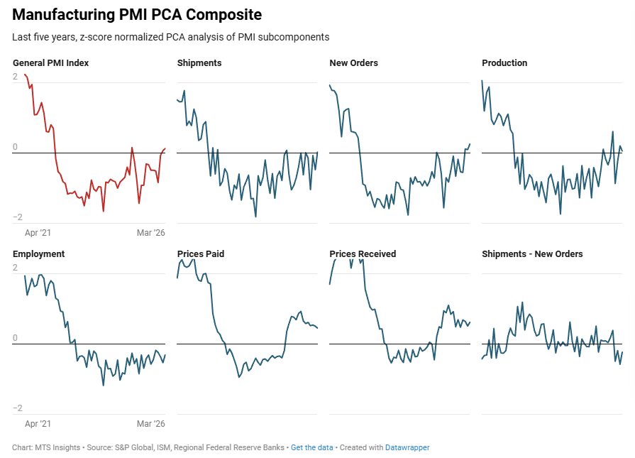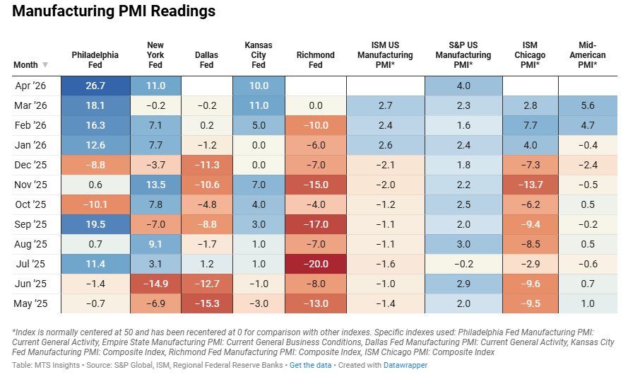 Index Mar 2026 (Final) Apr 2026 (1st; 2/9) Apr 2026 (2nd; 4/9) Apr 2026 (Final) General PMI 0.13 0.41 0.41 Shipments 0.03 0.70 0.61 New Orders 0.26 0.81 0.77 Production 0.07 0.07 0.03 Employment -0.31 -0.37 -0.46 Prices Paid 0.45 0.75 1.04 Prices Received 0.62 0.87 0.98