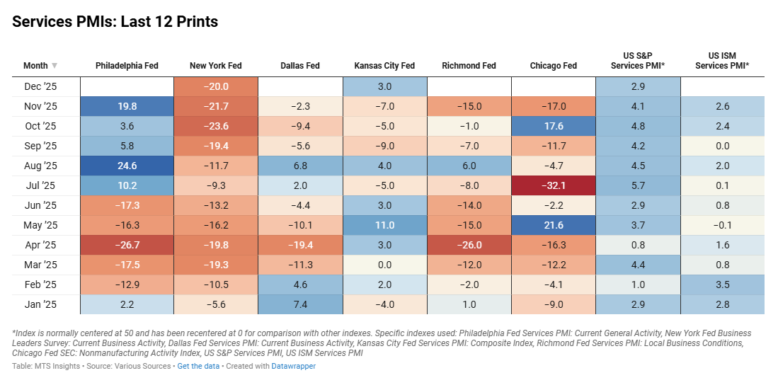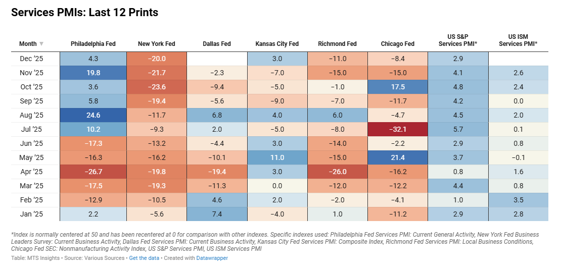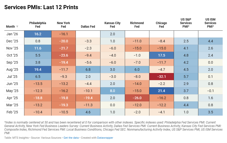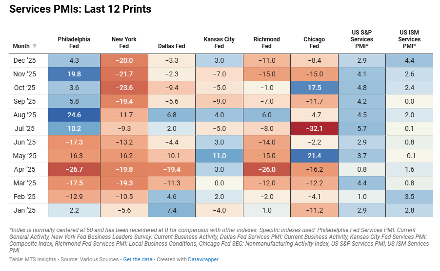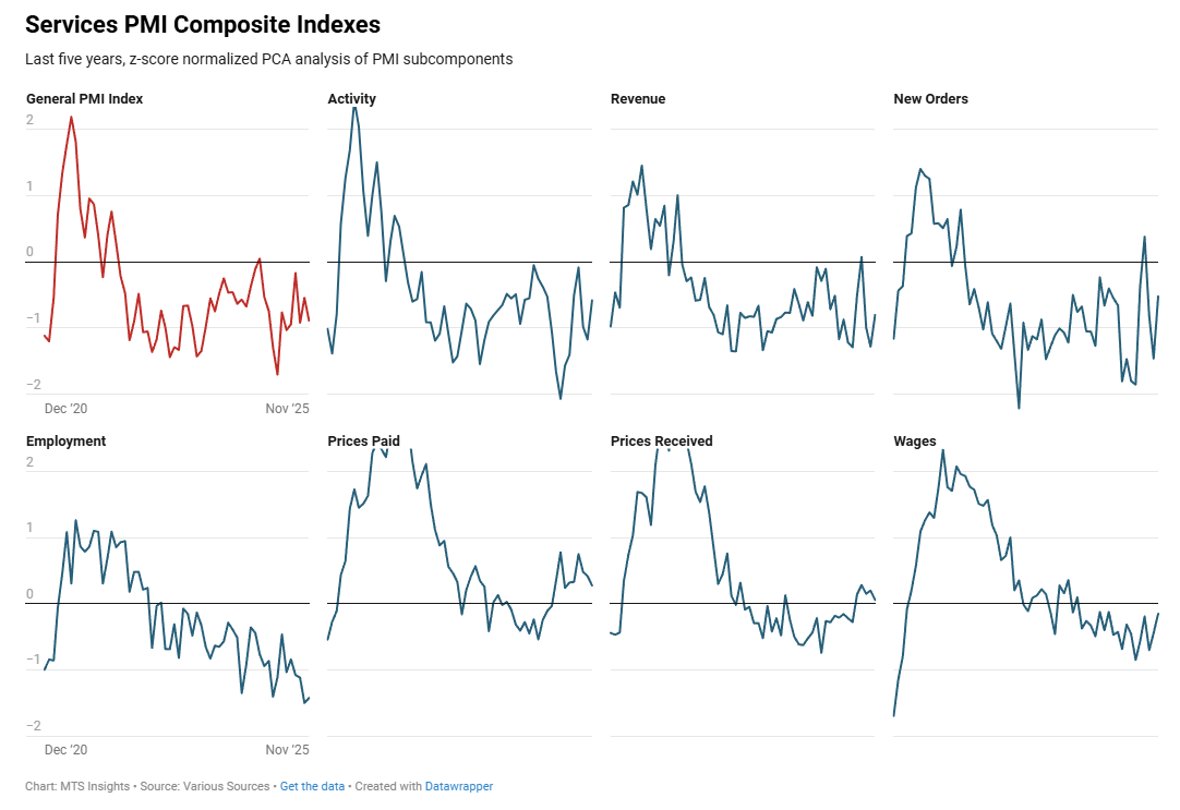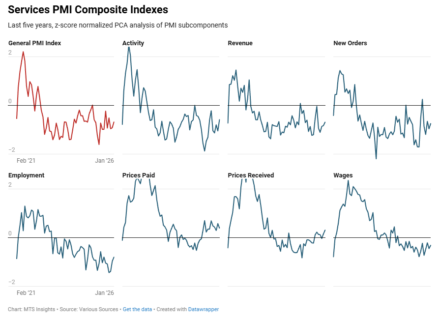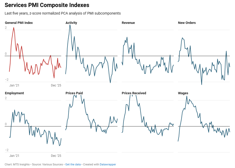 Index Dec 2025 (Final) Jan 2026 (1st; 3/8) Jan 2026 (2nd) Jan 2026 (Final) General PMI -0.91 -0.67 Activity -1.04 -0.58 Revenue -0.82 -0.68 New Orders -0.95 -0.74 Employment -0.97 -0.80 Prices Paid 0.58 0.40 Prices Received 0.15 0.31 Wages -0.45 -0.31
