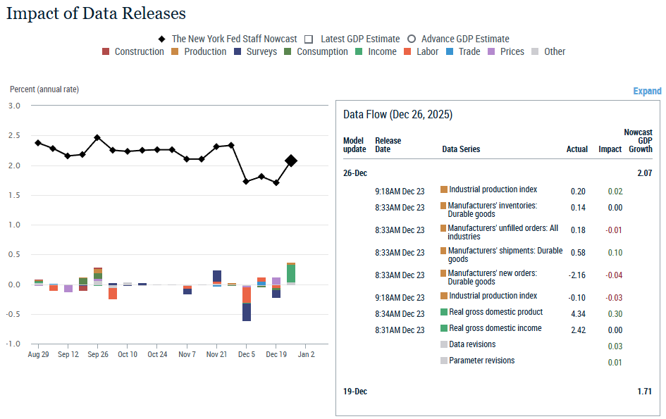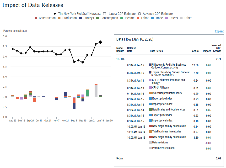 The New York Fed Staff Nowcast for 2025 Q4 is 2.7%, with the 50% probability interval at [1.6, 4.0]% and the 80% interval at [0.6, 5.1]%. The Staff Nowcast for 2026 Q1 is 2.7%.