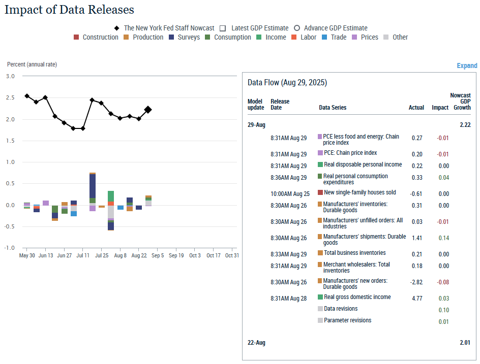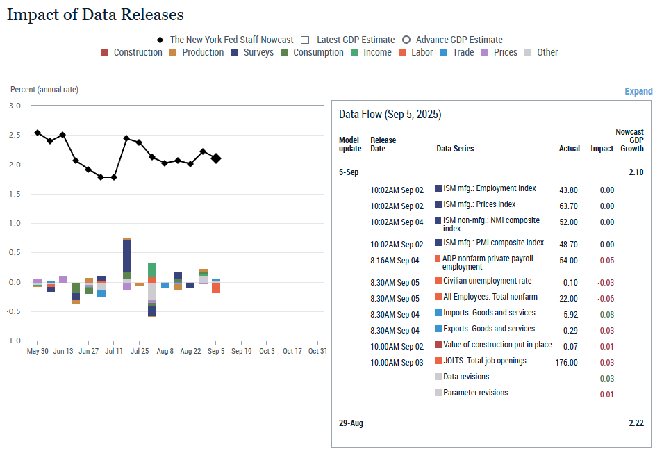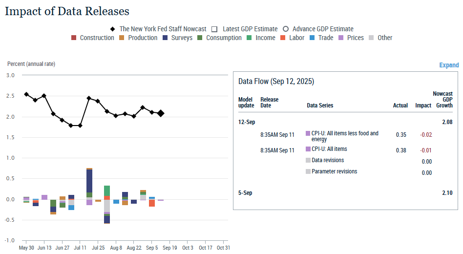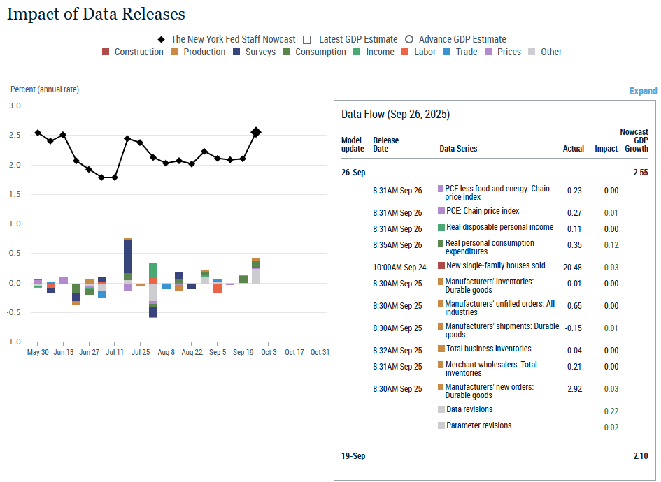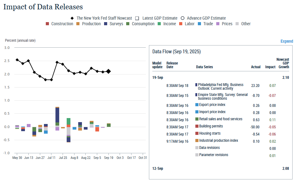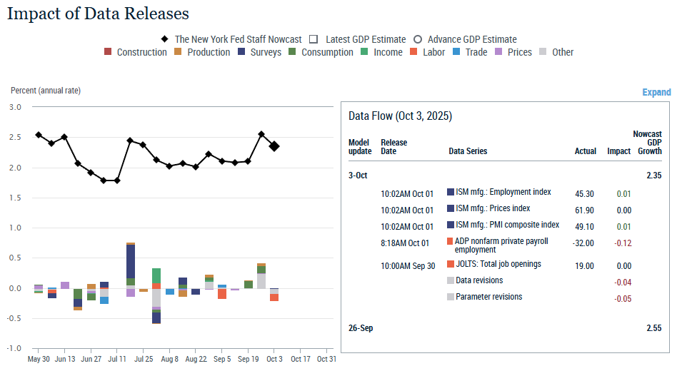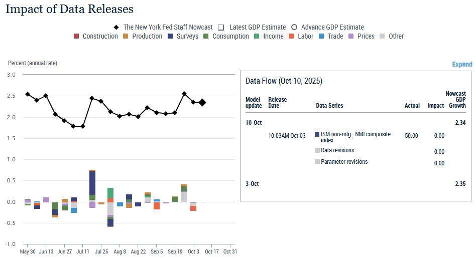 The New York Fed’s GDP Nowcast for Q4 2025 edged slightly lower to 2.34% as of October 10 (from 2.35% on October 3), as the government shutdown led to the cancellation of several key reports.