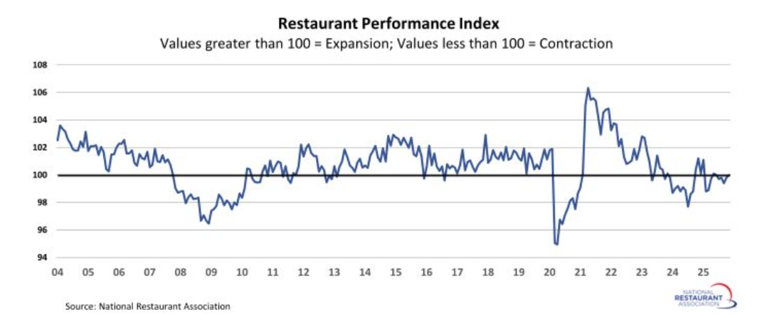 The Restaurant Performance Index (RPI) increased to 100.0 from 99.8 in October (+0.2% MoM), reaching its highest level since June and signaling overall industry conditions at the expansion threshold.