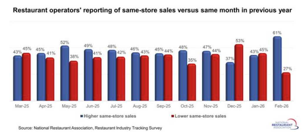 Sixty-one percent of restaurant operators said their same-store sales rose between February 2025 and February 2026, according to the National Restaurant Association’s monthly tracking survey. That was up from 43% who reported higher sales in January.