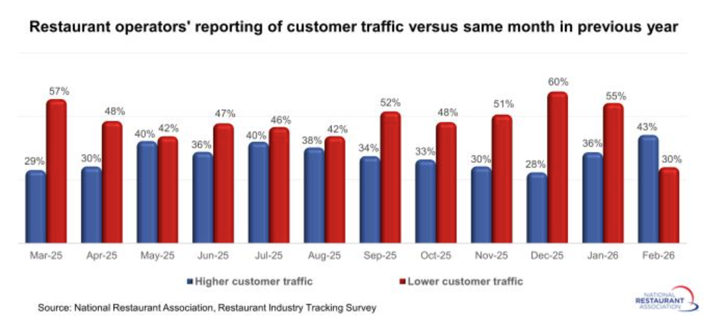Forty-three percent of operators said their customer traffic rose between February 2025 and February 2026, up from 36% in January. Thirty percent of restaurant operators reported lower traffic in February, down from 55% in January.