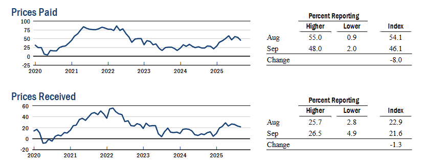 Price pressures strengthened: prices paid rose to 49.1 (+6.3 pts MoM) and prices received to 22.2 (+7.8 pts MoM), indicating faster input and selling price increases.