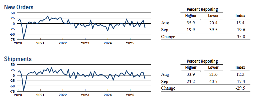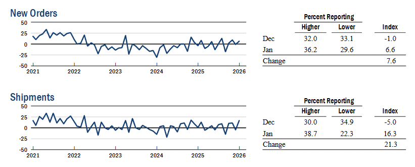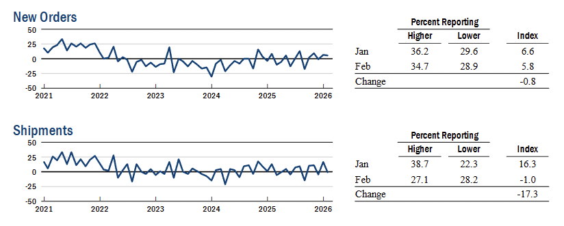New orders registered 5.8 while shipments fell to -1.0 (-17.3 pts MoM), indicating demand expanded but output flow was essentially flat.