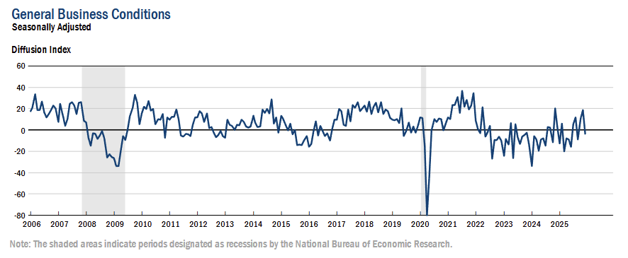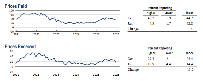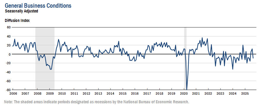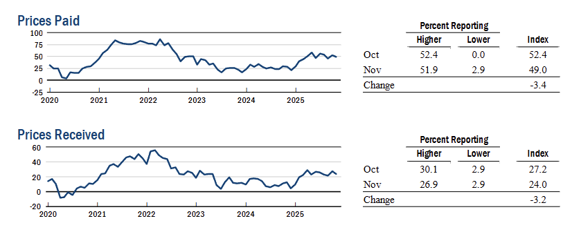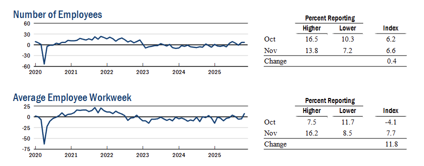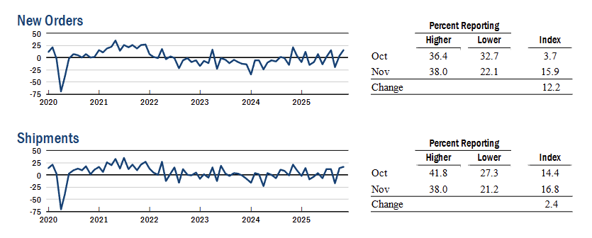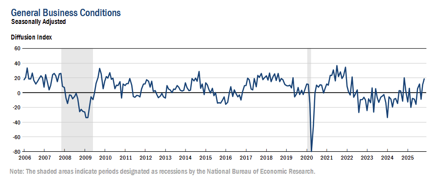 Firms’ outlook improved, with the future business conditions index at 34.7 (+4 pts) and the capital expenditures index at 18.2 (+8 pts, multi year high), showing stronger expectations for activity and investment.