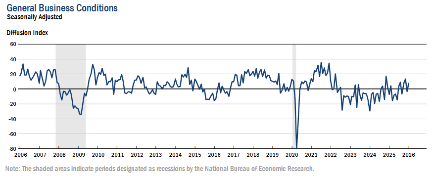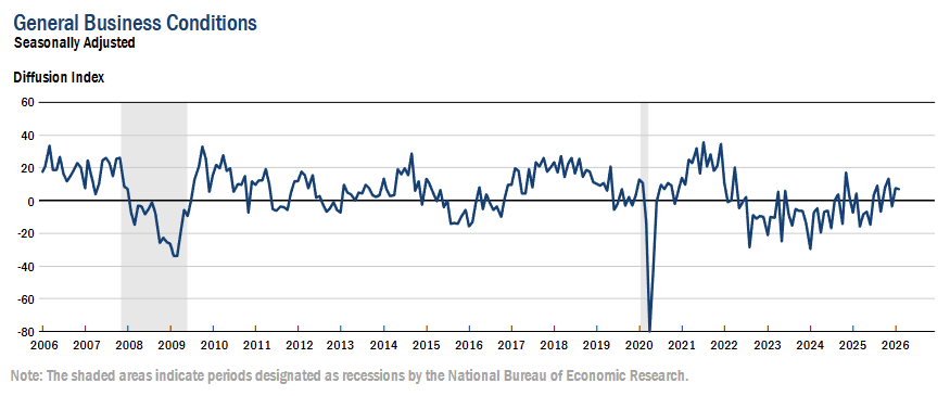 The general business conditions index held at 7.1 (0.0 pts MoM), marking the fourth positive reading in five months and signaling continued modest growth in activity.