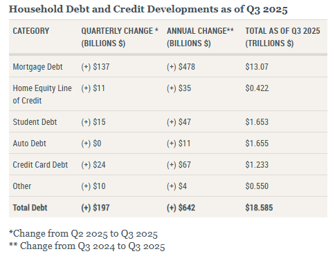 Mortgage balances increased $98B QoQ (+$565B YoY) to $13.17T, remaining the primary driver of overall debt growth despite rising mortgage delinquencies.