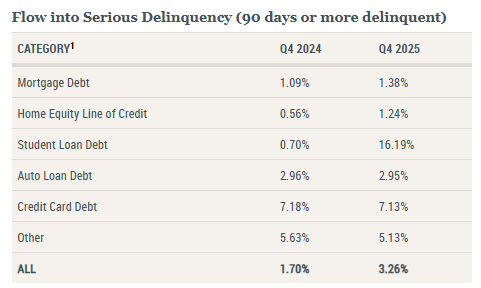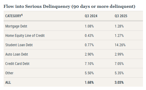 The broad US debt serious delinquency rate increased 23 bps QoQ to 3.26% and is up from 1.70% a year ago (due to student loan delinquencies reappearing in the data in 2025).
