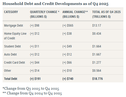 Total household debt rose $191B (+1.0% QoQ, +$740B YoY) to $18.78T in Q4 2025, showing modest balance growth alongside worsening delinquency trends.