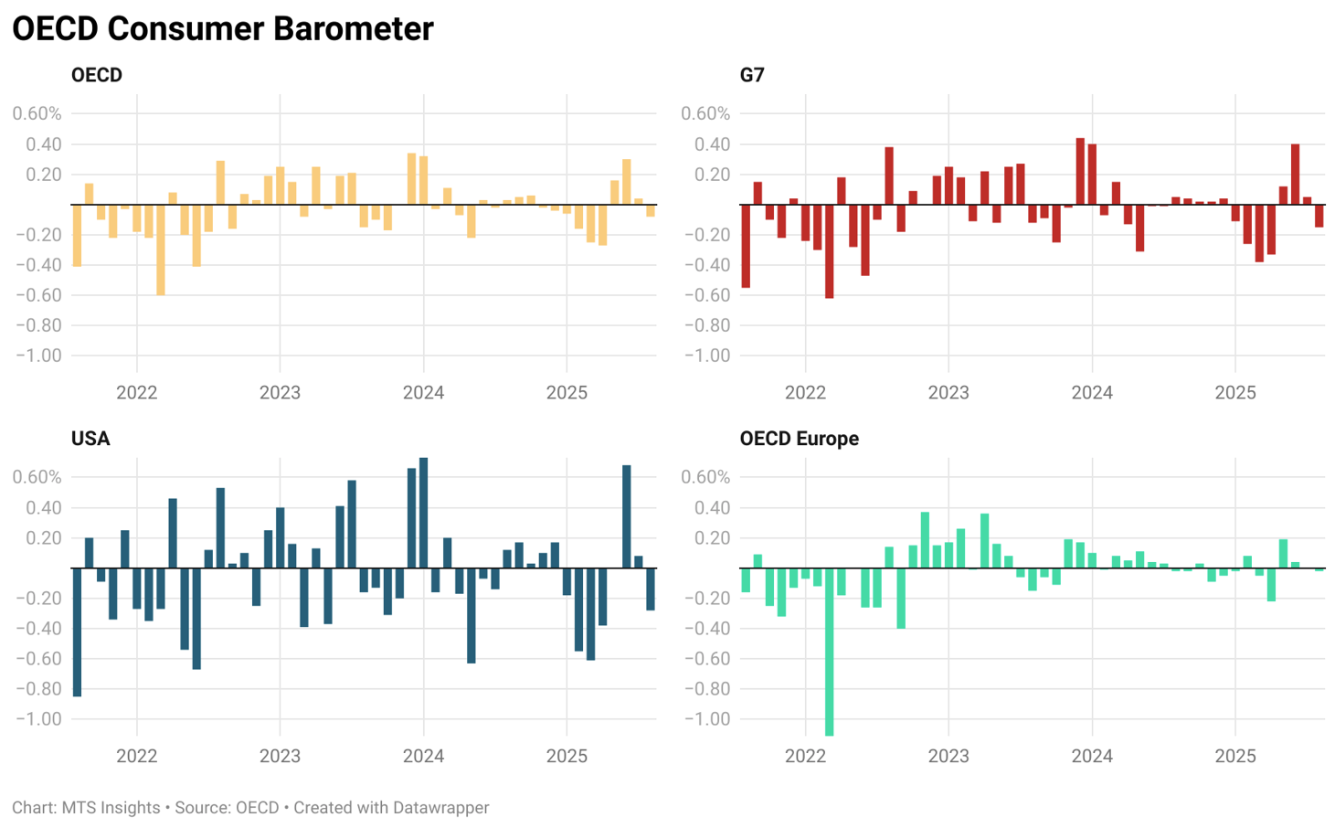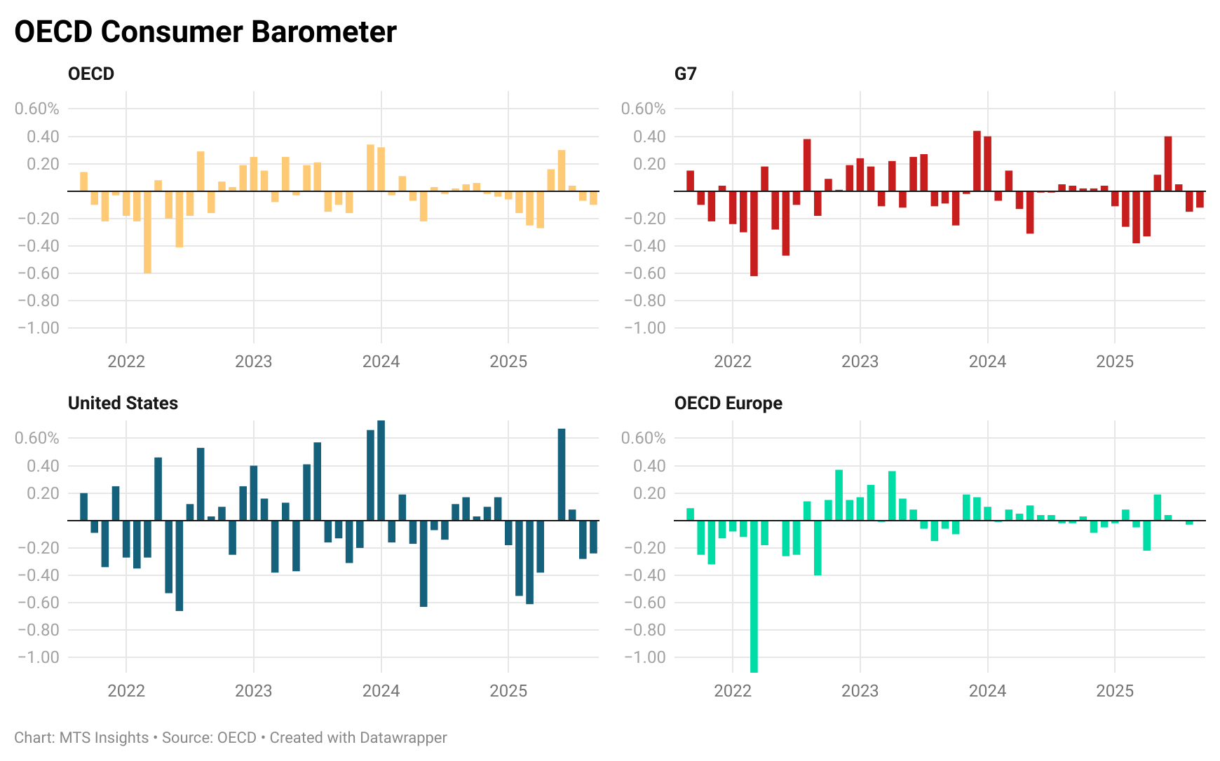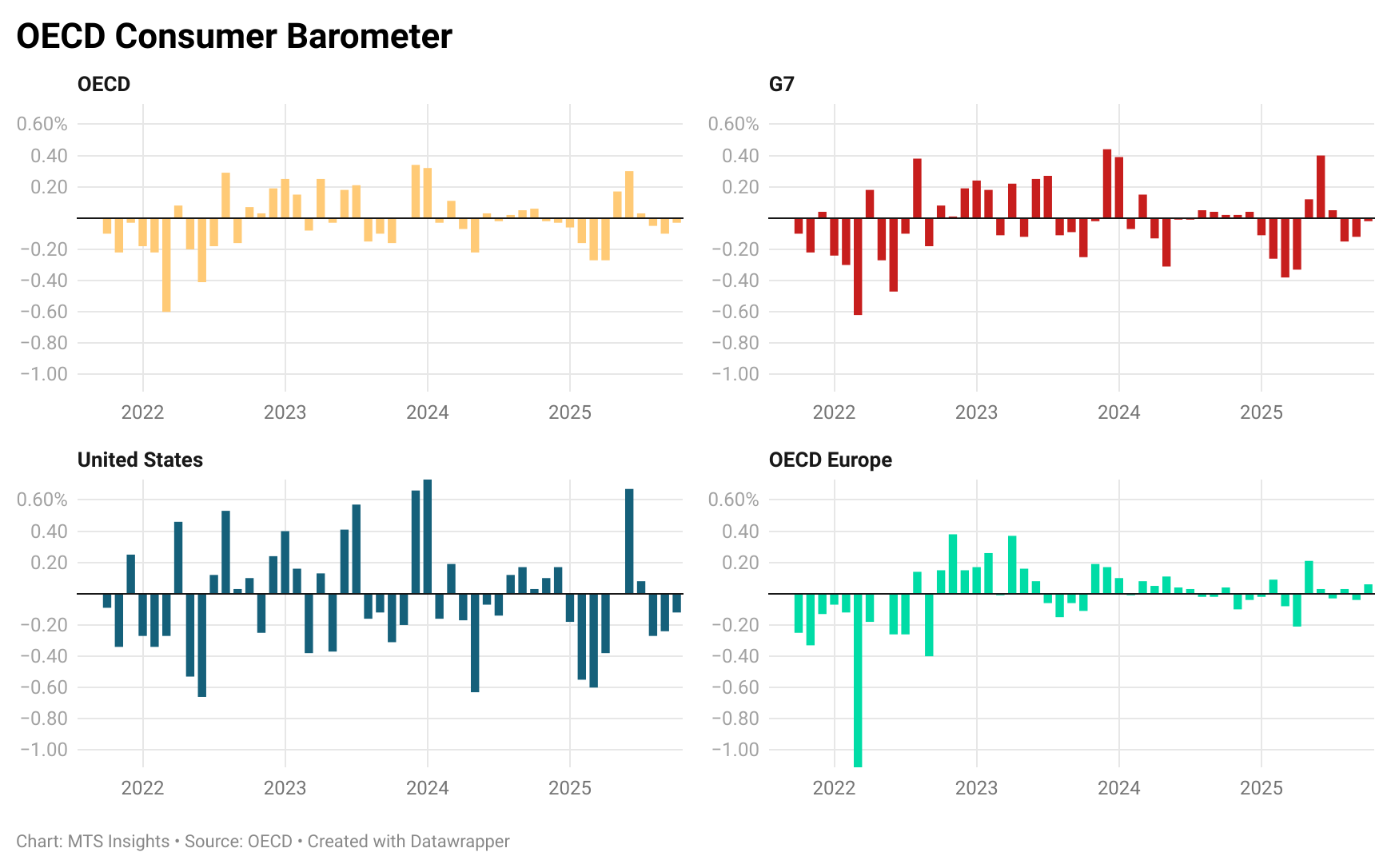 The OECD Consumer Barometer edged down for the third straight month, down -0.03% MoM in October, due to persistent weakness in the US.