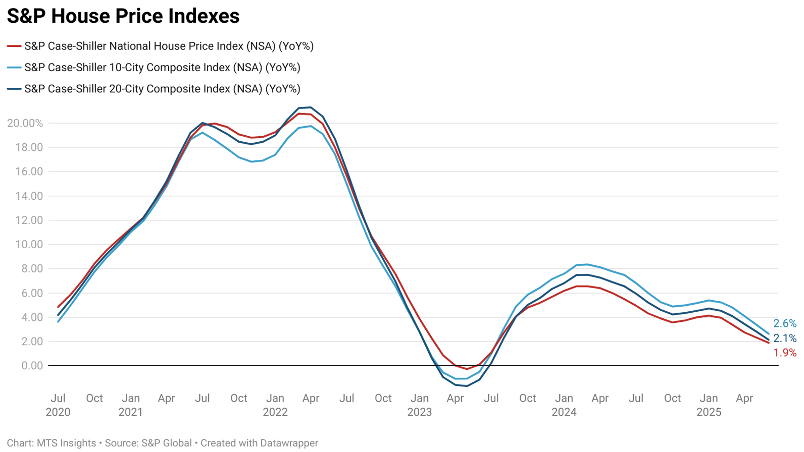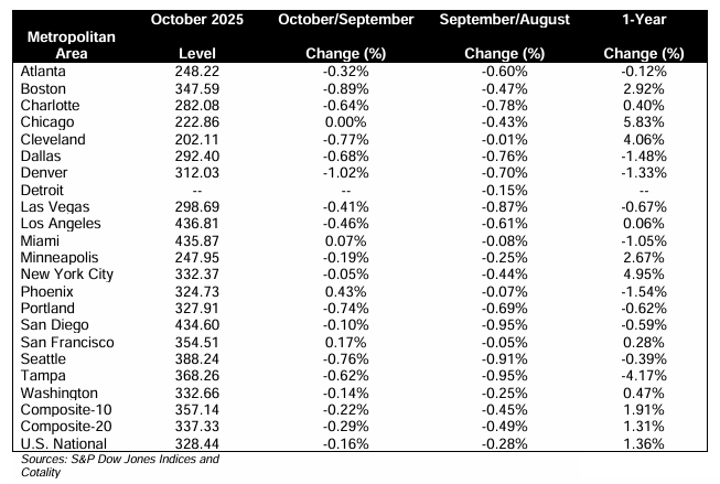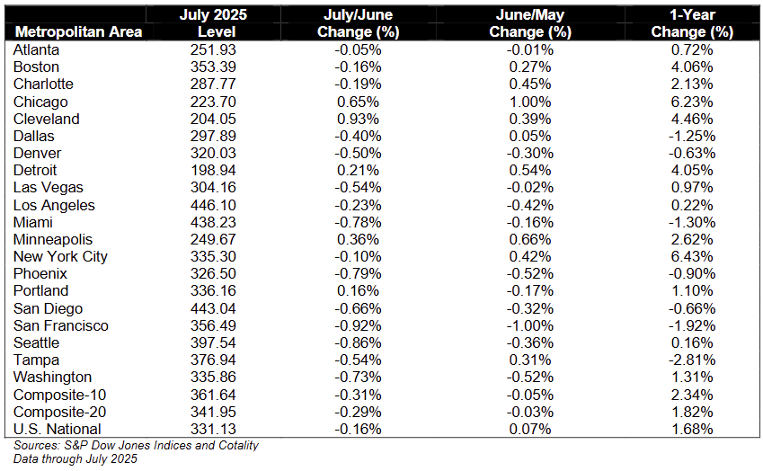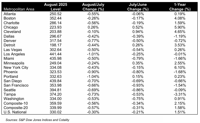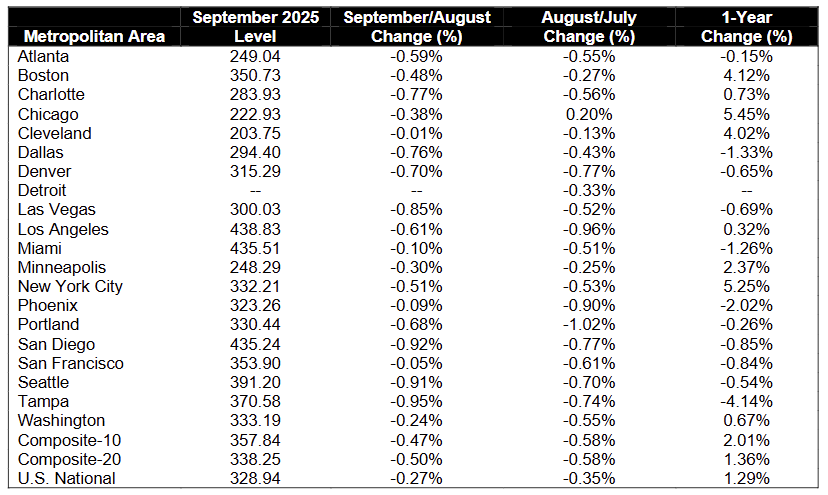 On a non-seasonally adjusted basis, the National Index fell -0.1% MoM, with 15 of 20 major metro areas posting monthly declines, signaling broad short-term softness.