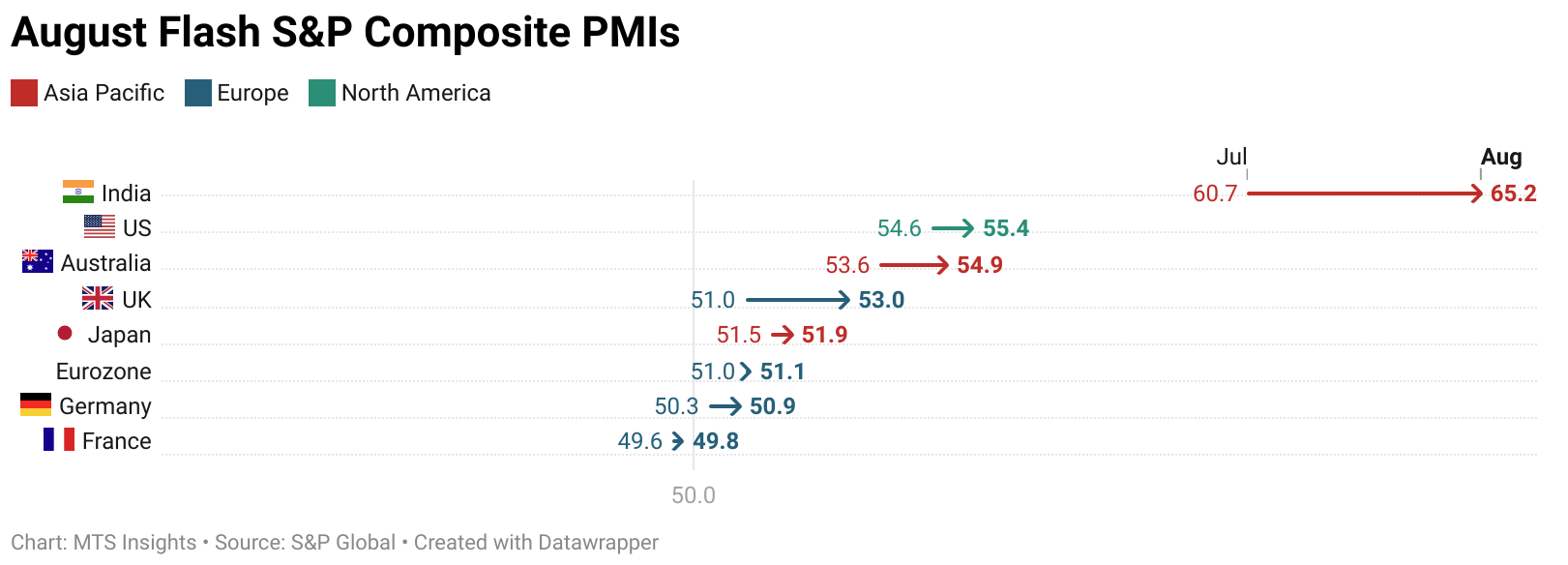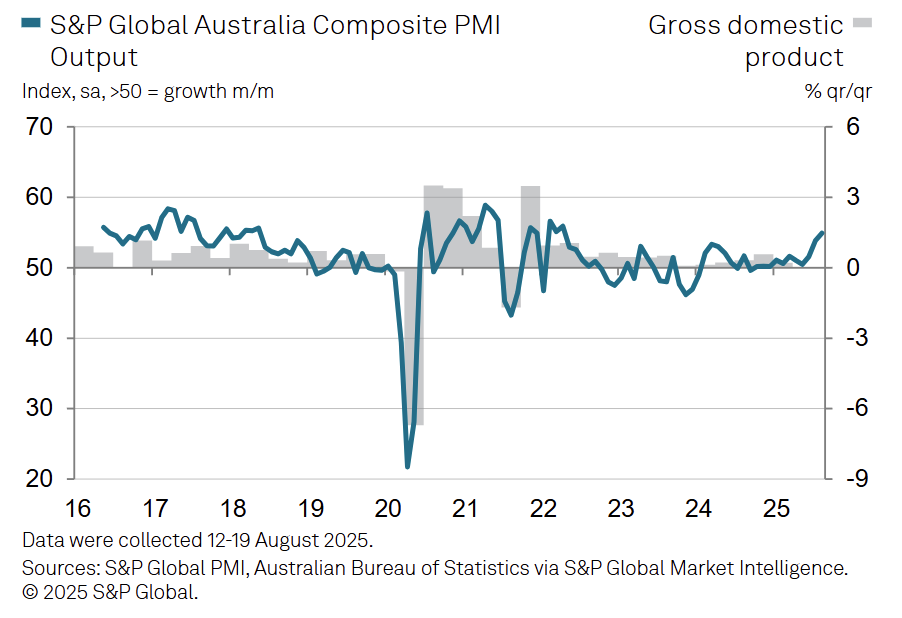 Australia’s Flash Composite PMI rose to 54.9 in August (Jul: 53.8), the highest since April 2022, signaling the fastest private sector output growth in over three years.