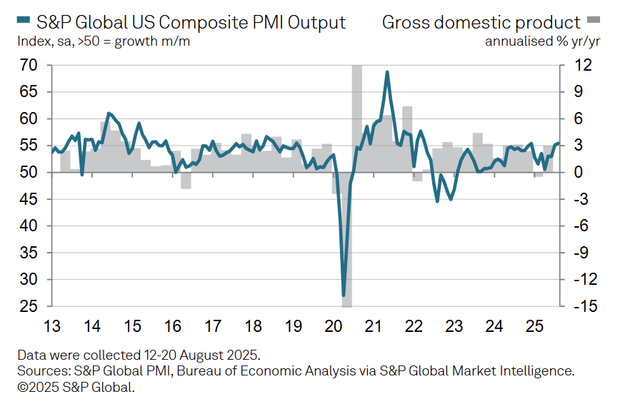 US business activity expanded at the fastest pace of 2025 so far, with the S&P Global Flash Composite PMI rising to 55.4 in August (Jul: 55.1), while average selling prices saw their sharpest increase in three years.