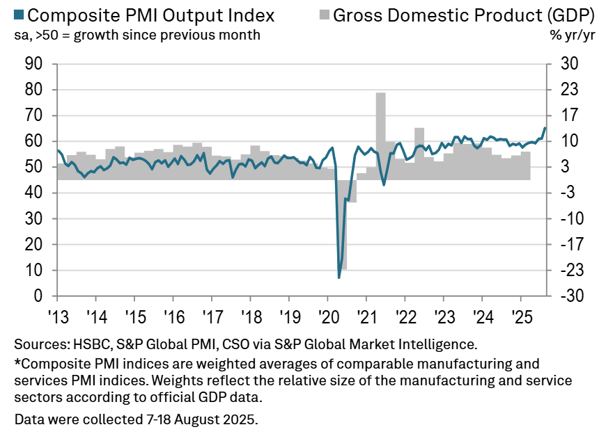 Services activity remained robust at 55.1 (Jul: 55.3), supported by the steepest sales growth since Dec 2024 and a modest recovery in export demand.