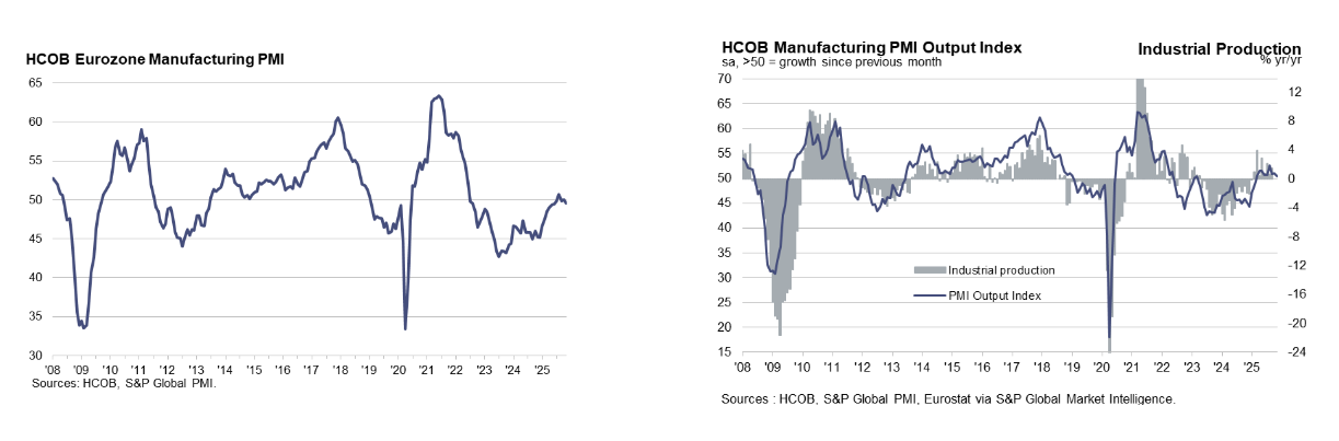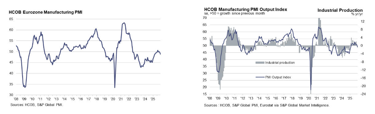 Eurozone manufacturing activity weakened further in December, with the HCOB Eurozone Manufacturing PMI falling to 48.8 (from 49.6 in November), reflecting a renewed decline in output and faster demand deterioration.
