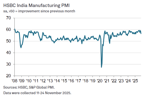 India’s HSBC Manufacturing PMI fell to 55.0 in December (from 56.6 in November), marking easing growth momentum while remaining firmly in expansion.