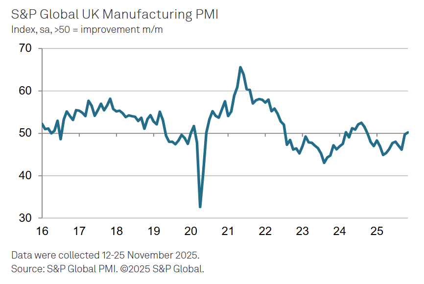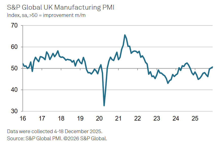 The UK Manufacturing PMI rose to 50.6 in December (from 50.2 in November), marking a 15-month high and signaling continued, modest expansion.