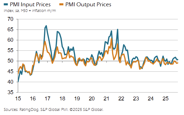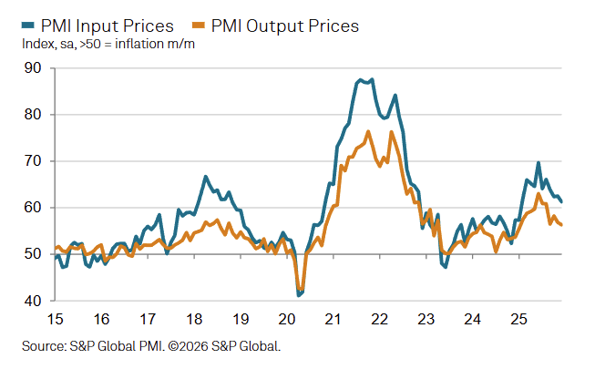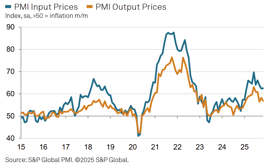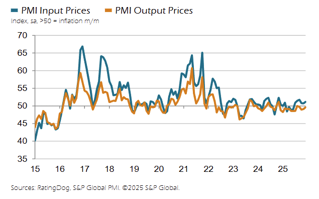 Input cost inflation remained historically subdued and little changed from November, while output price inflation eased to a nine-month low, signaling limited pricing pressures.