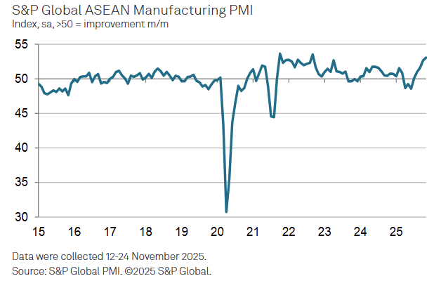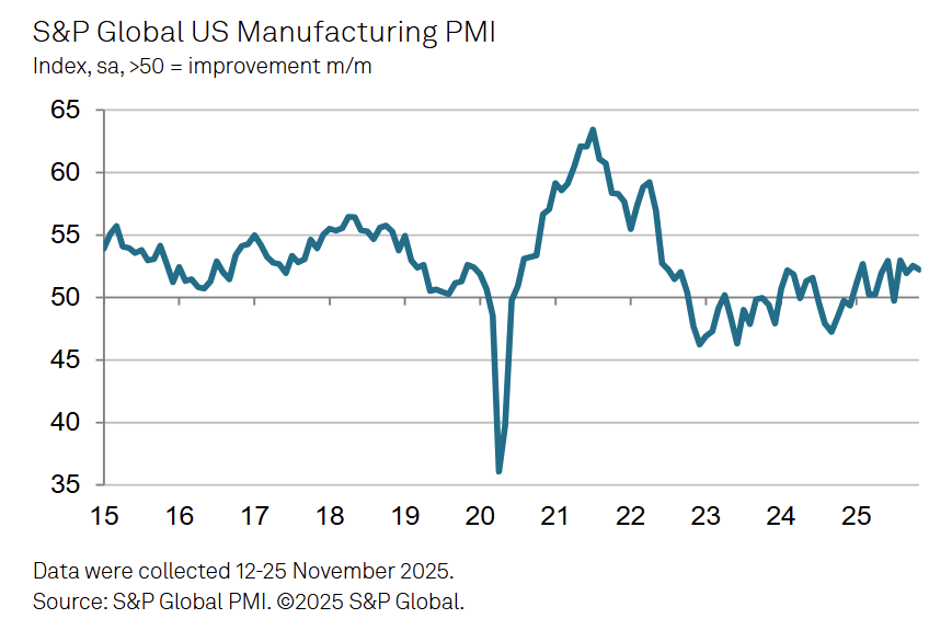 The US S&P Manufacturing PMI eased to 51.8 in December (from 52.2 in November), marking a slower pace of expansion as demand weakened despite continued output growth.