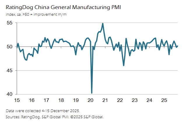 China’s Manufacturing PMI rose to 50.1 in December (from 49.9 in November), signaling a marginal return to expansion at year-end.