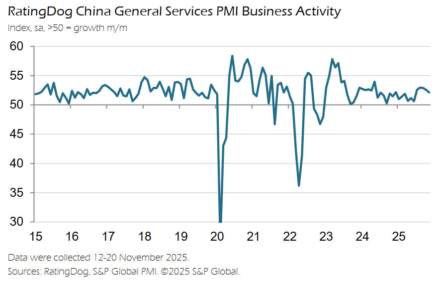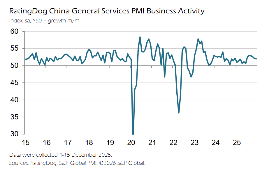 China’s RatingDog General Services Business Activity Index eased to 52.0 in December (from 52.1 in November), marking the slowest services expansion since June amid softer new orders growth and continued job shedding.