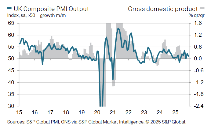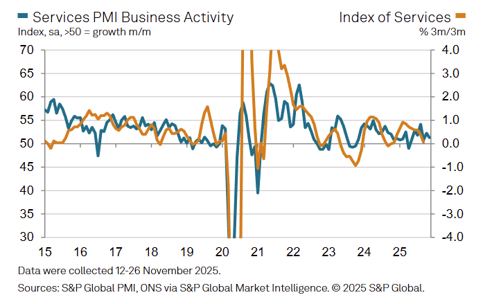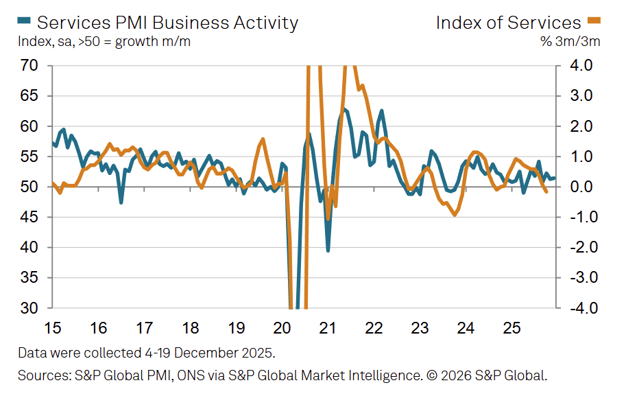 The S&P Global UK Services PMI edged up to 51.4 in December (from 51.3 in November), indicating continued but marginal expansion amid subdued demand conditions.