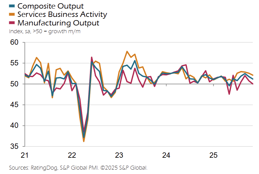 The Composite PMI fell -1.3 pts MoM to 51.5, a three-month low, indicating continued expansion but at the weakest pace since September as momentum softened late in the year.