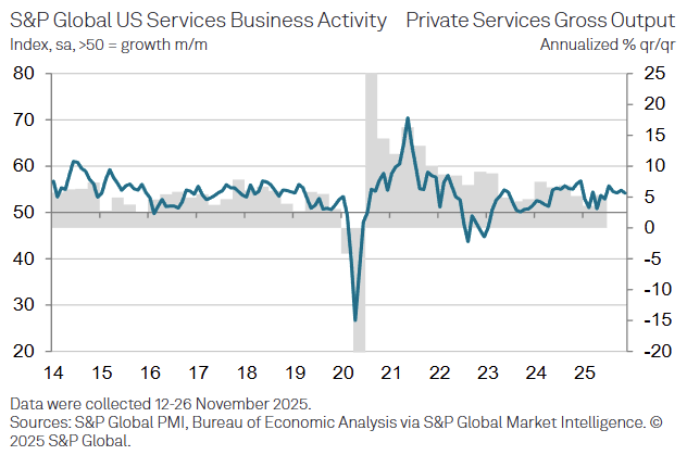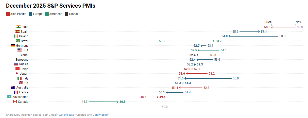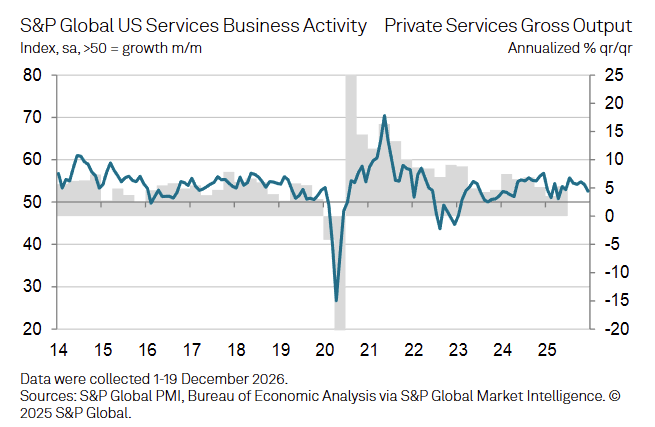 The S&P Global US Services PMI fell to 52.5 in December (from 54.1 in November), signaling slower services activity growth amid cooling demand late in the year.