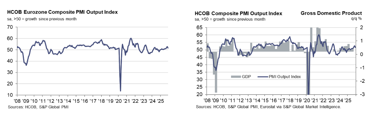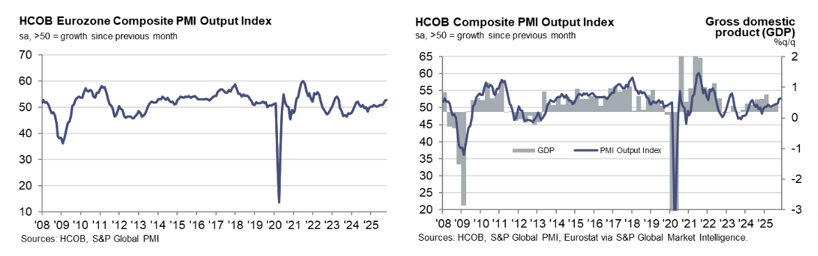 The HCOB Eurozone Composite PMI Output Index eased to 51.5 in December (from 52.8 in November), marking slower private-sector growth but rounding out the strongest quarterly expansion since Q2 2023.