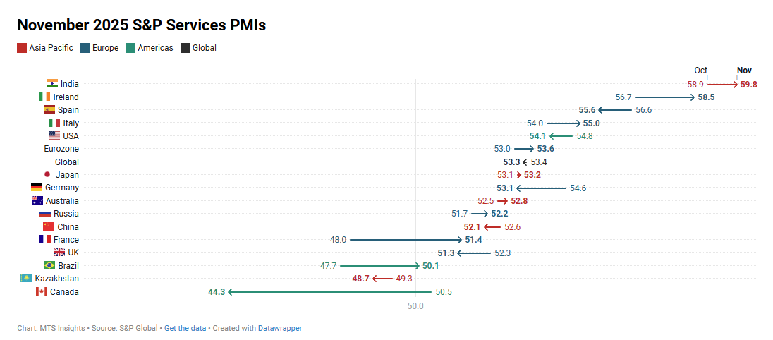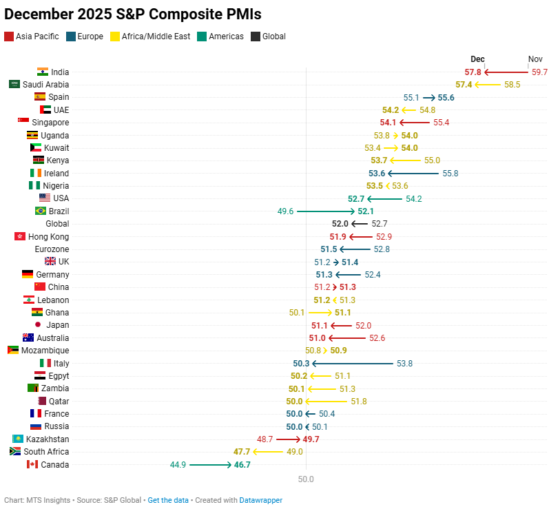 The three-month average Composite PMI for Q4 stood at 52.3, the highest since Q2 2023, underscoring that December’s slowdown followed a solid quarter overall.