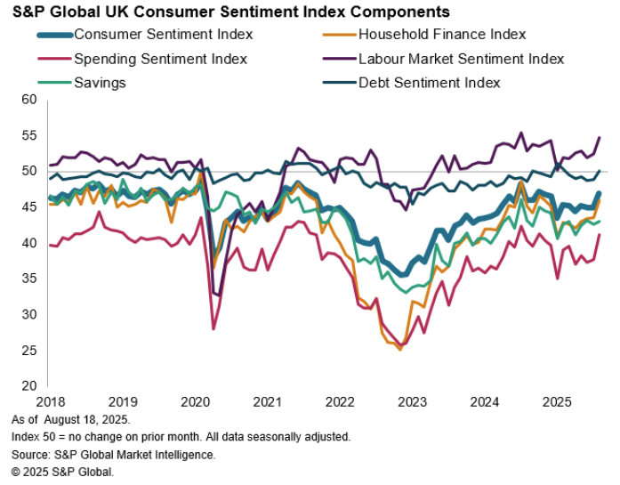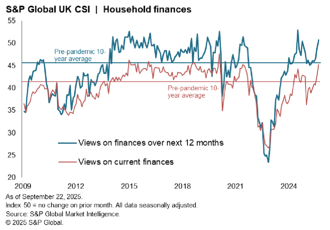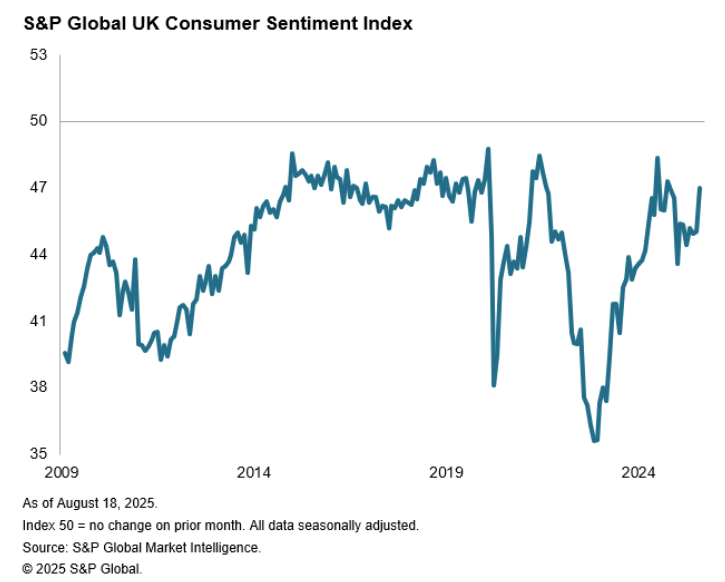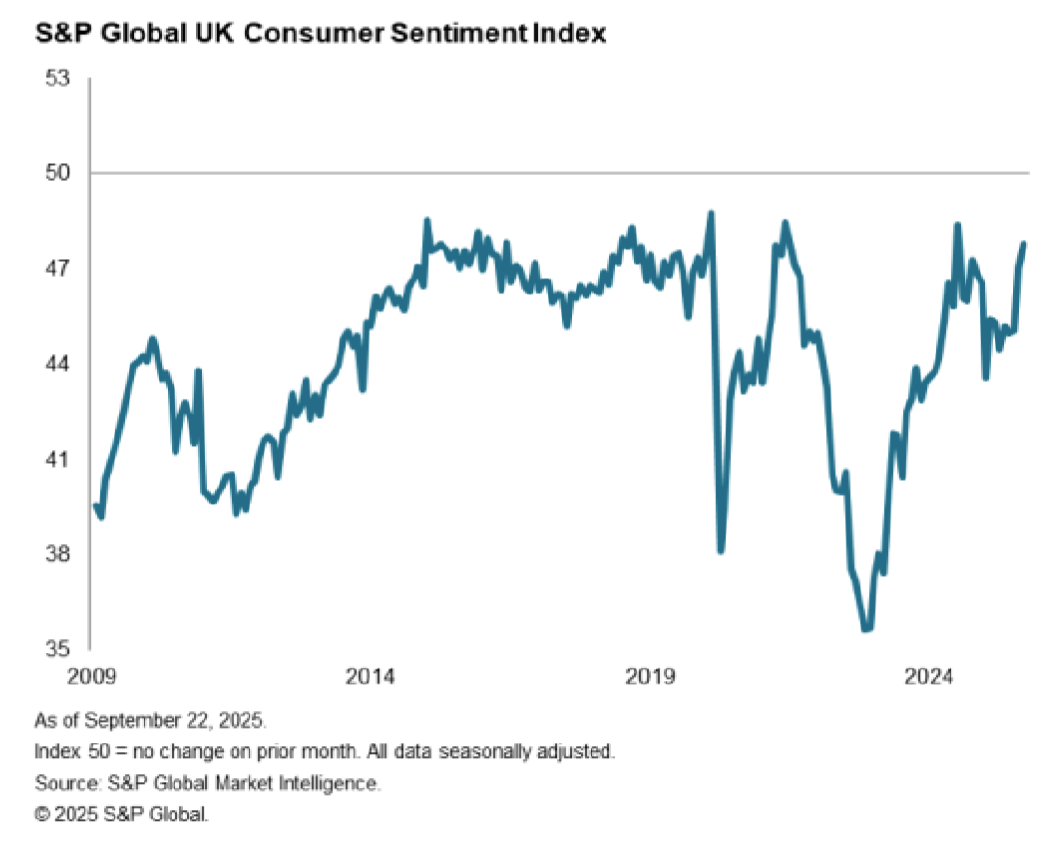 The S&P Global UK Consumer Sentiment Index rose to 47.8 in September from 47.0 in August, reaching a 14-month high and signaling improved household outlook despite persistent financial pressures.