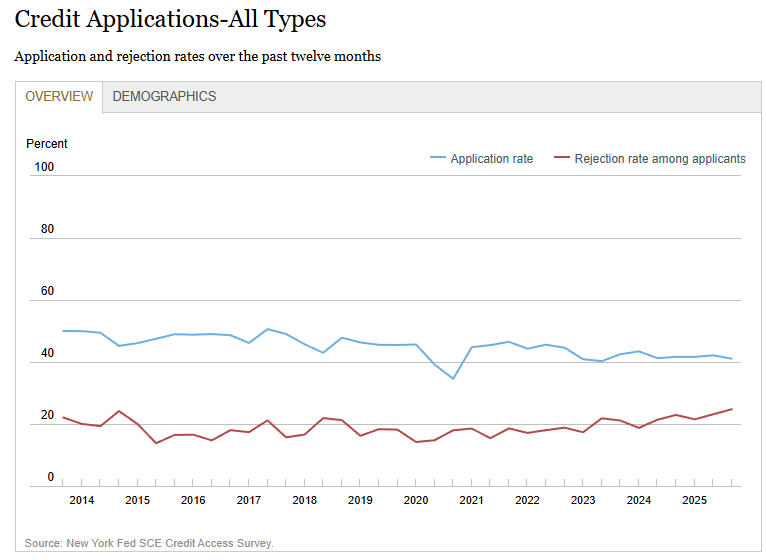 - The overall rejection rate for any kind of credit over the past twelve months increased to 24.8 percent from 23.1 percent in June, a new series high. Rejection rates increased for home loans, car loans, and mortgage refinancing.