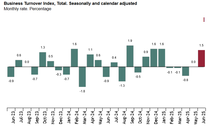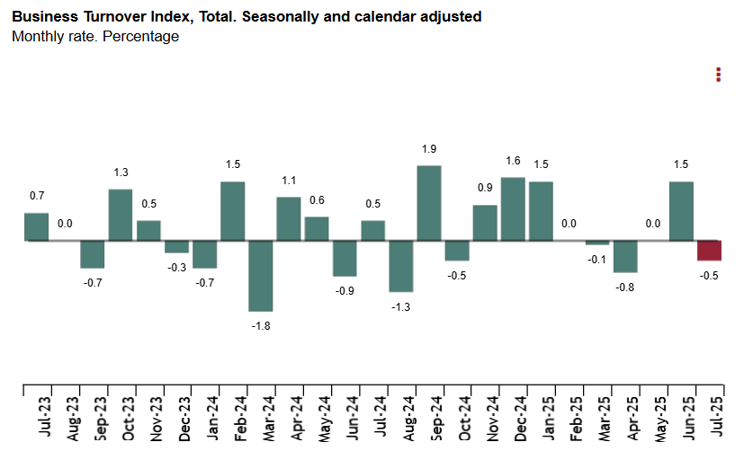 Spain’s Business Turnover Index (seasonally & calendar adjusted) rose 4.1% YoY in July 2025 but fell -0.5% MoM, indicating solid annual growth but a slight monthly pullback.