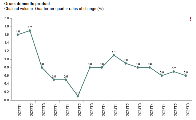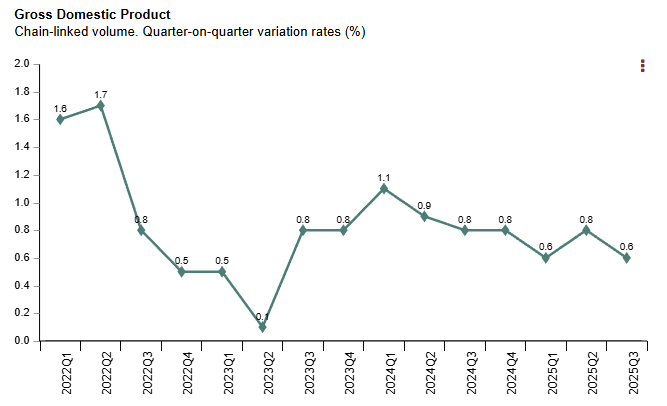 Spain’s GDP growth in Q3 2025 was confirmed at +0.6% QoQ (down from +0.7% in Q2) and +2.8% YoY, showing slightly slower momentum with domestic demand leading growth.