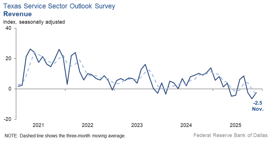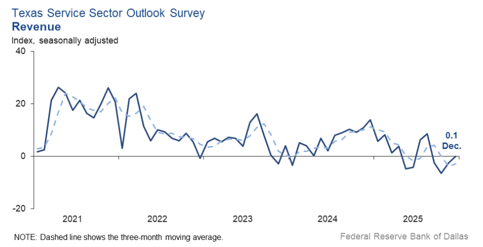 Texas service sector activity improved in January, with the revenue index rising to +7.8 from 0, indicating modest growth after flat conditions in December.