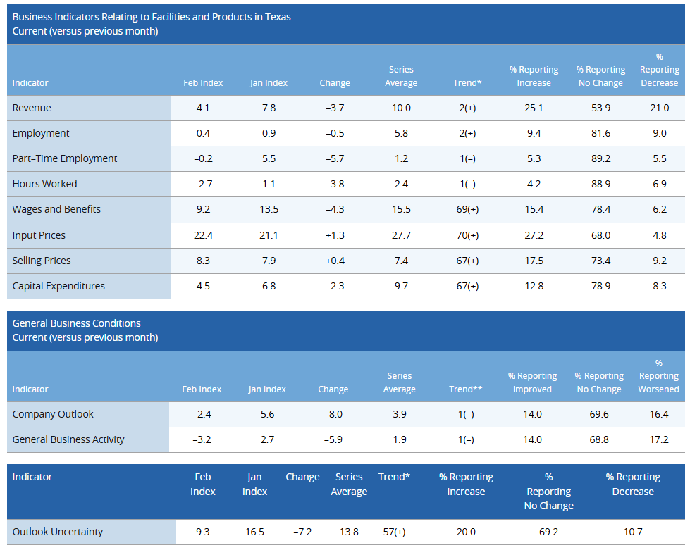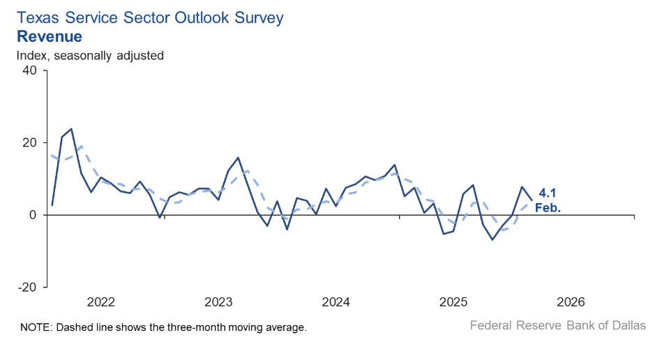 Texas service sector activity remained slightly positive in February, with the revenue index at 4.1, indicating modest expansion despite softer sentiment.