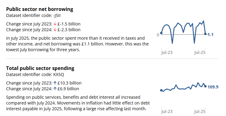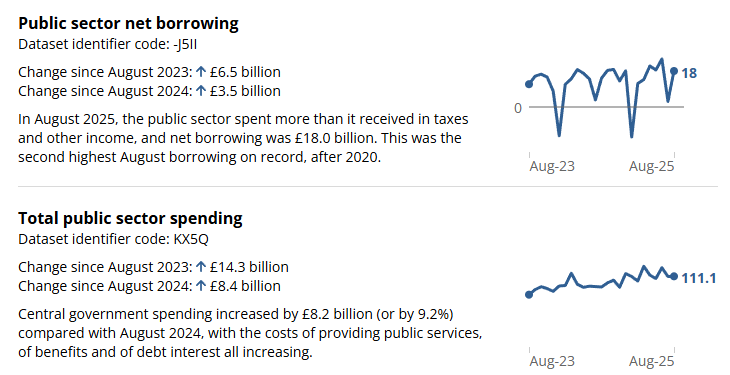 UK public sector net borrowing was £18.0 billion in August 2025, up +£3.5 billion YoY and the highest August in five years, reflecting stronger current spending and debt interest.