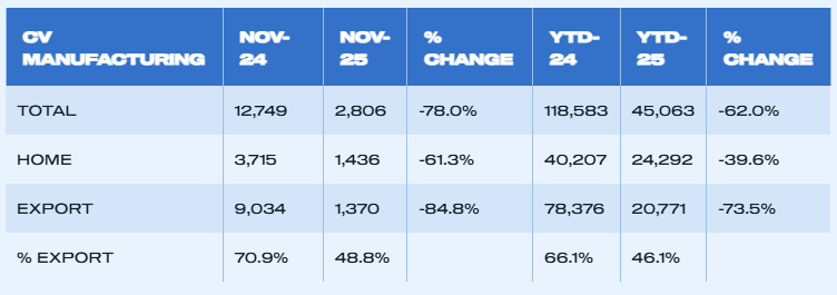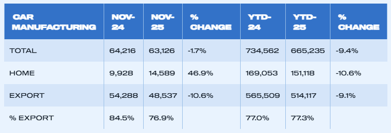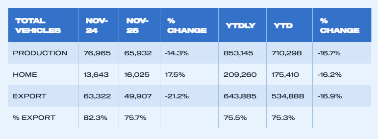 Vehicle production down -14.3% in November with 65,932 cars and commercial vehicles leaving factories.